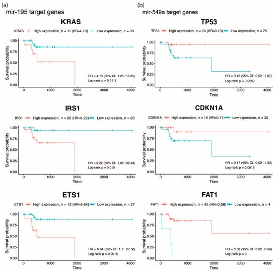 One of the most important features of EO-CRC is its aggressive clinical presentation at diagnosis, frequently associated with peritoneal metastasis. Accordingly, we focused on pathways related to angiogenesis, migration and cellular invasion, and by overall survival analysis, we found that high expression of KRAS, IRS1, ETS1 (targets of hsa-miR-195, Figure 2a) and low expression of TP53, CDKN1A and FAT1 (targets of hsa-miR-549a, Figure 2b) were associated with low survival (HR: 4.73, 8.22, 6.84, 0.13, 0.17 and 0.08), suggesting that hsa-miR-195 and hsa-miR-549a target genes may serve as potential prognostic biomarkers in CRC. Altogether, these findings highlight hsa-miR-195 and hsa-miR-549a as promising regulators of key oncogenic pathways in CRC.