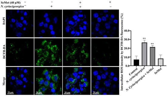 Effects of SeMet on N. cyriacigeorgica-induced increased in ROS concentrations in bMECs. In bMECs infected with N. cyriacigeorgica, ROS was increased (p < 0.01). However, in bMECs pretreated with 40 μM SeMet for 6 h before infection with N. cyriacigeorgica (MOI = 5:1), the ROS concentration was decreased (p < 0.01). In addition, ROS concentration of bMECs only pretreated with 40 μM SeMet for 6 h was not significantly different from the control. Data are means ± SD of three independent experiments. ** p < 0.01.