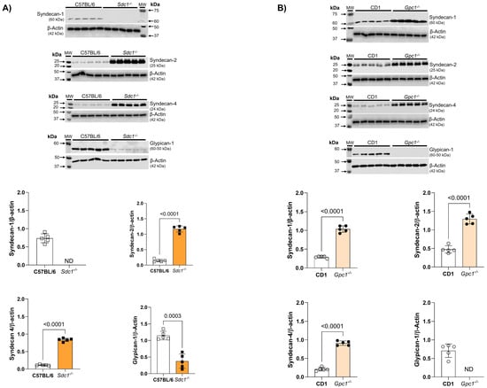 We confirmed the deletion of Sdc1 and Gpc1 in our knockout lines by immunoblotting. As expected, Sdc1 expression was absent in Sdc1−/− aortas. This was associated with the reduced expression of Gpc1 and increased expression of Syndecan 2 (Sdc2) and Syndecan 4 (Sdc4) when compared with C57BL/6 aorta samples (Figure 3A). Additionally, we confirmed the absence of Gpc1 in Gpc1−/− aorta homogenates. This was associated with the increased expression of Sdc1, Sdc2, and Sdc4 when compared to CD1 aorta samples (Figure 3B).