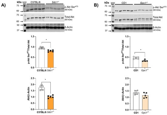 Akt activity was assessed by the ratio between Akt phosphorylation at Serine473 residues and total Akt expression. Akt activity was reduced in aortic rings from Sdc1−/− and Gpc1−/− mice (Figure 4A,B). Total Akt expression was decreased in aortic rings from Sdc1−/− mice compared to C57BL/6 but remained unchanged between Gpc1−/− and CD1 mice (Figure 4B).