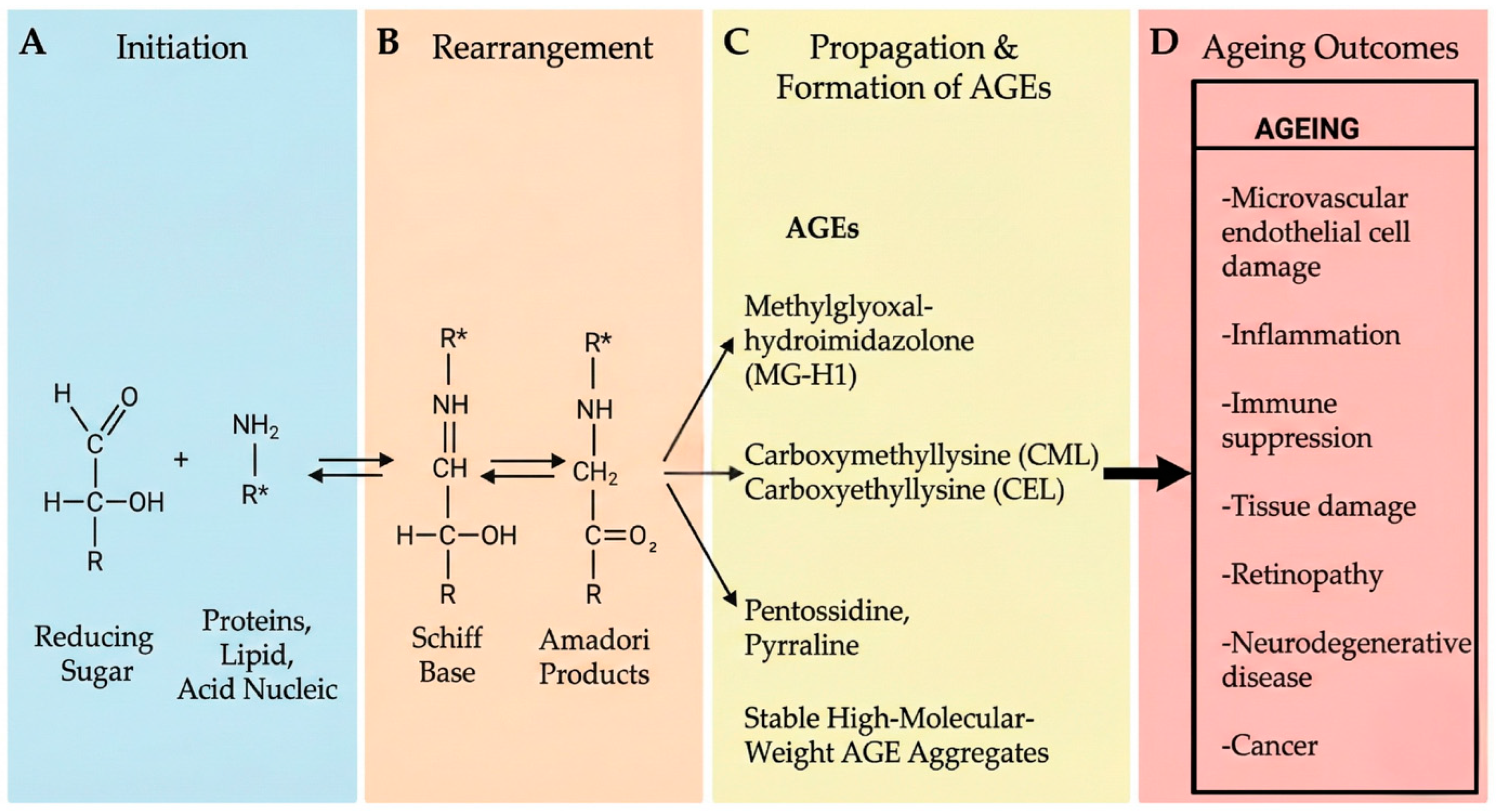 - Twarda-Clapa, A.; Olczak, A.; Białkowska, A.M.; Koziołkiewicz, M. Advanced Glycation End-Products (AGEs): Formation, Chemistry, Classification, Receptors, and Diseases Related to AGEs. Cells 2022, 11, 1312. [Google Scholar] [CrossRef]