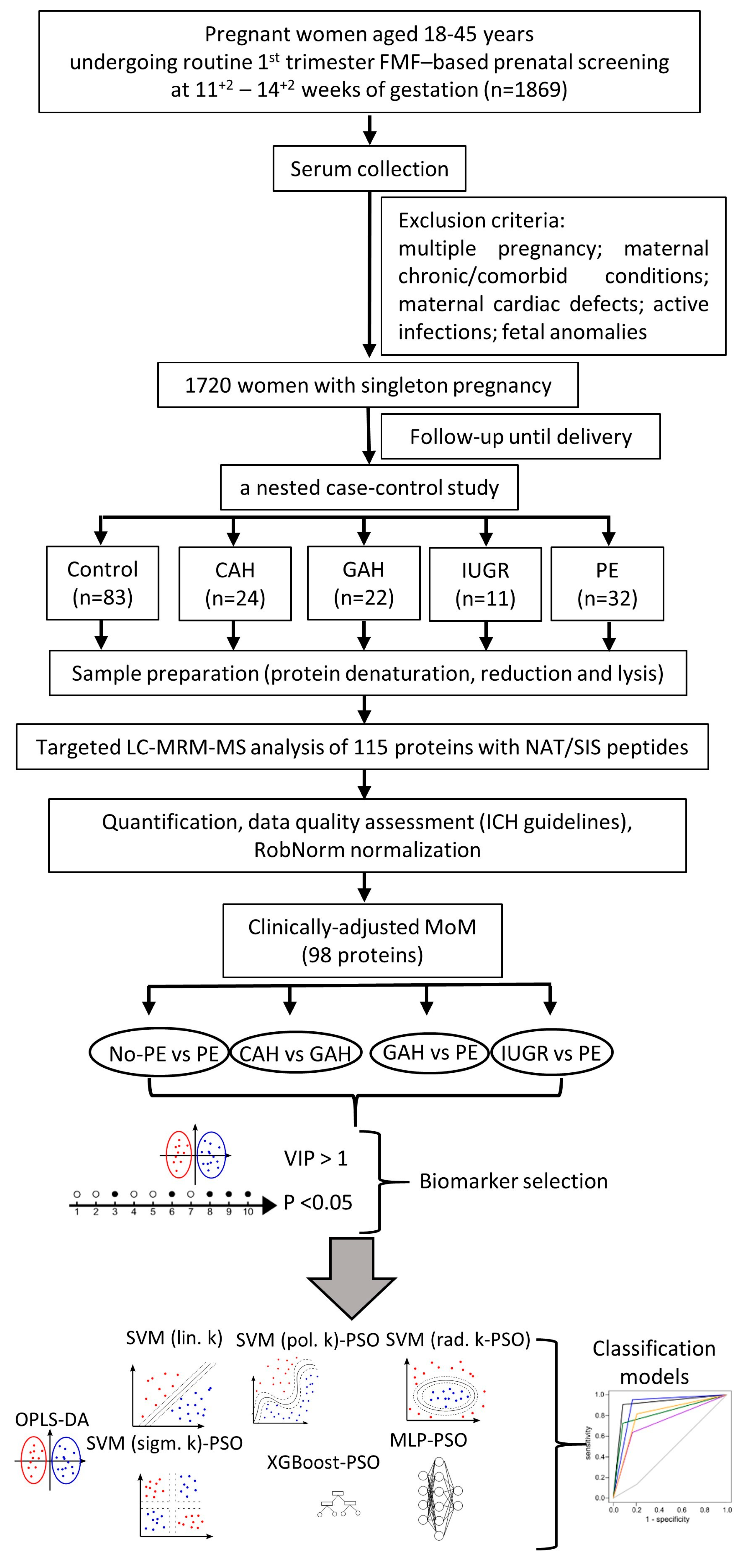 | IUGR vs. PE | F10, C8A, C1QA, AHSG, C1QC, SERPING1, TTR, IGHG1, VTN, FCN3 | SVM, pol. kernel (degree = 3.7, γ = 1.9 × 10−7, coef0 = −310) | 0.94 | 1 | 0.95 | 1 | 0.85 | 0.97 |