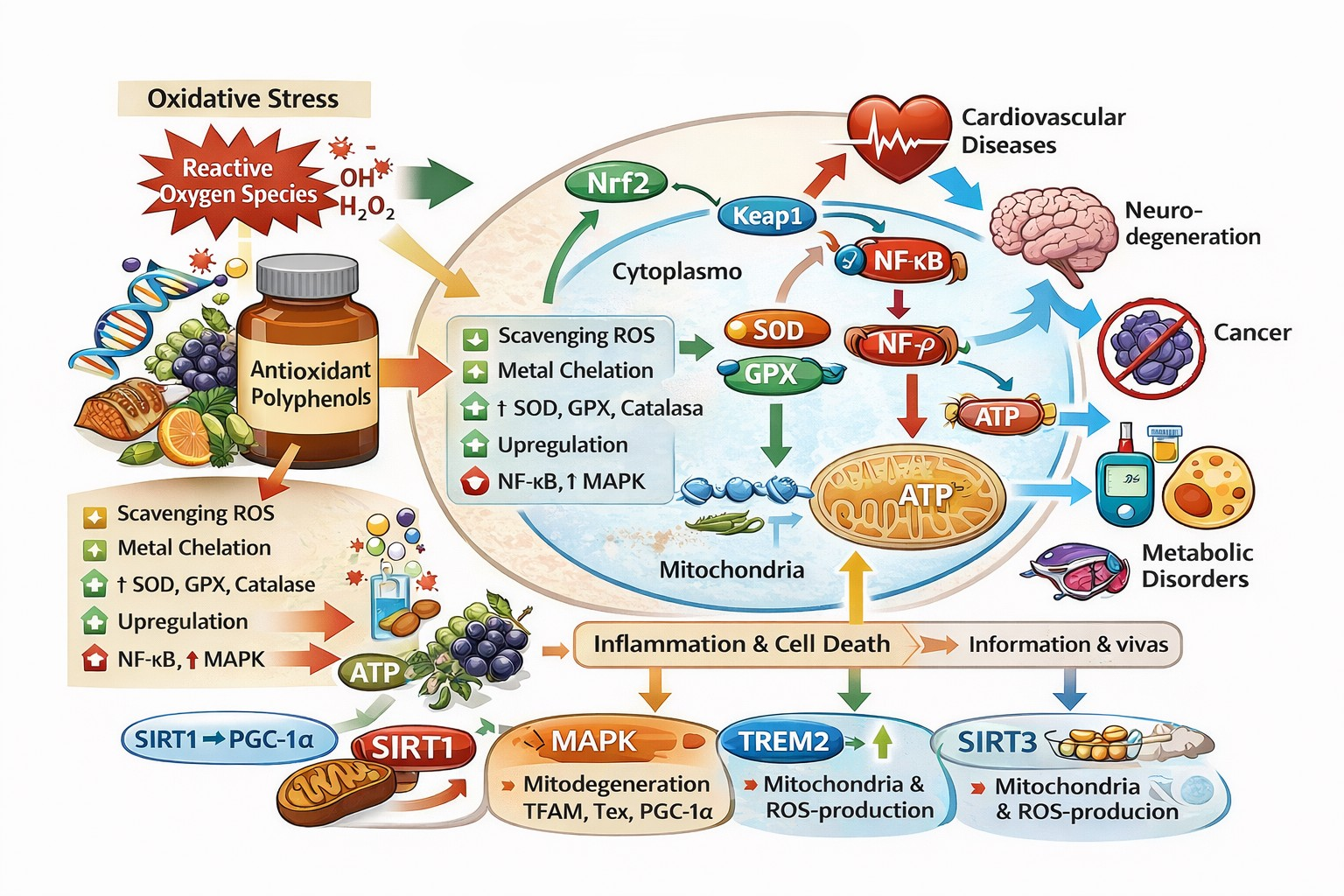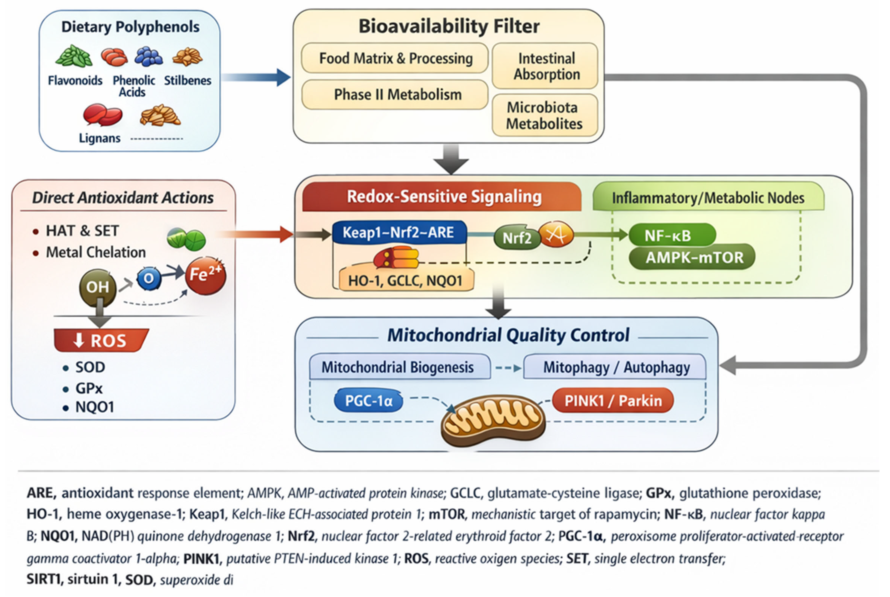 - Includes direct antioxidant chemistry (HAT/SET and metal chelation) with oxidation–reduction-sensitive signaling (Keap1–Nrf2/ARE and key inflammatory pathways) and mitochondrial quality control processes within a unified mechanistic framework;