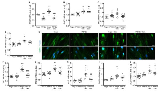 Effects of IP6K2 knockdown on IP6K isoform and pro-calcific marker expression in VSMCs during calcifying conditions. Relative mRNA expression (n = 10) of IP6K2 (A), IP6K1 (B), IP6K3 (C), CBFA1 (D), SP7 (F), MSX2 (G), ALPL (H), BMP2, (I) and BGLAP (J) in HAoSMCs transfected for 72h with negative control (Neg.si) or IP6K2 (IP6K2si) siRNA and treated for 48 h with control or calcification medium (Calc.). * (p < 0.05), ** (p < 0.01), *** (p < 0.001): significant compared to Neg.si-transfected group; † (p < 0.05), †† (p < 0.01), ††† (p < 0.001): significant compared to Neg.si-transfected and Calc.-treated group. (E) CBFA1 (green) and nuclei (blue) shown by confocal imaging in HAoSMCs transfected for 72 h with negative control (Neg.si) or IP6K2 (IP6K2si) siRNA and treated for 48 h with control or calcification medium (Calc.). Scale bar: 20 µm.