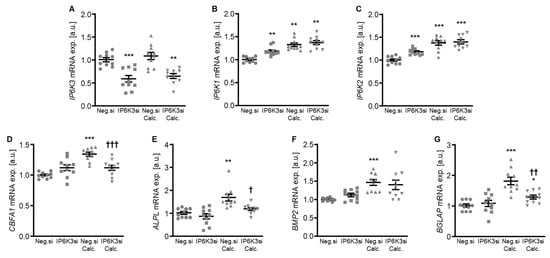 Effects of IP6K1 knockdown on IP6K isoform and pro-calcific marker expression in VSMCs during calcifying conditions. Relative mRNA expression (n = 10) of IP6K1 (A), IP6K2 (B), IP6K3 (C), CBFA1 (D), ALPL (E), BMP2 (F), and BGLAP (G) in HAoSMCs transfected for 72 h with negative control (Neg.si) or IP6K1 (IP6K1si) siRNA and treated for 48 h with control or calcification medium (Calc.). * (p < 0.05), ** (p < 0.01), *** (p < 0.001): significant compared to Neg.si-transfected group; † (p < 0.05), †† (p < 0.01): significant compared to Neg.si-transfected and Calc.-treated group.