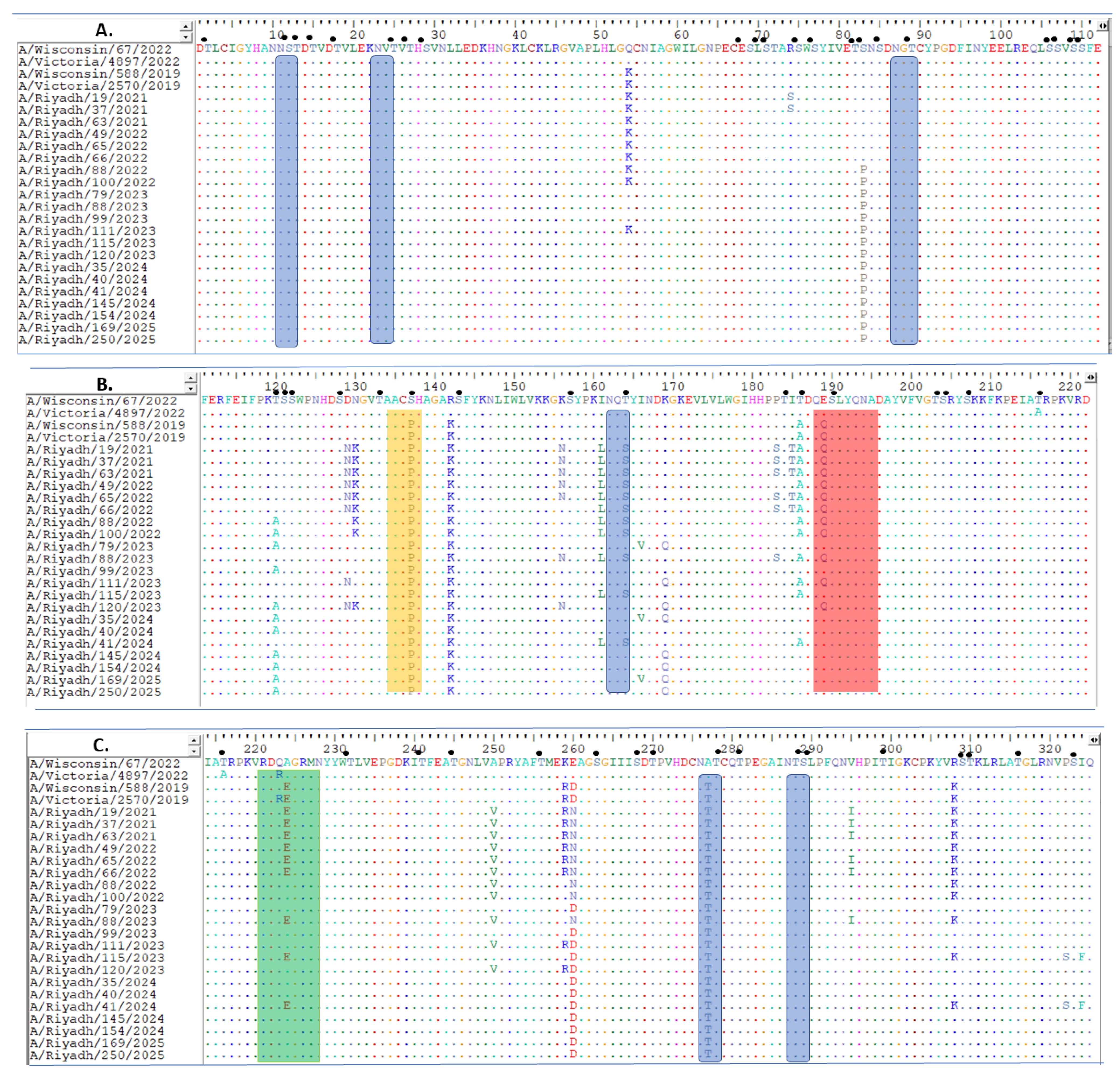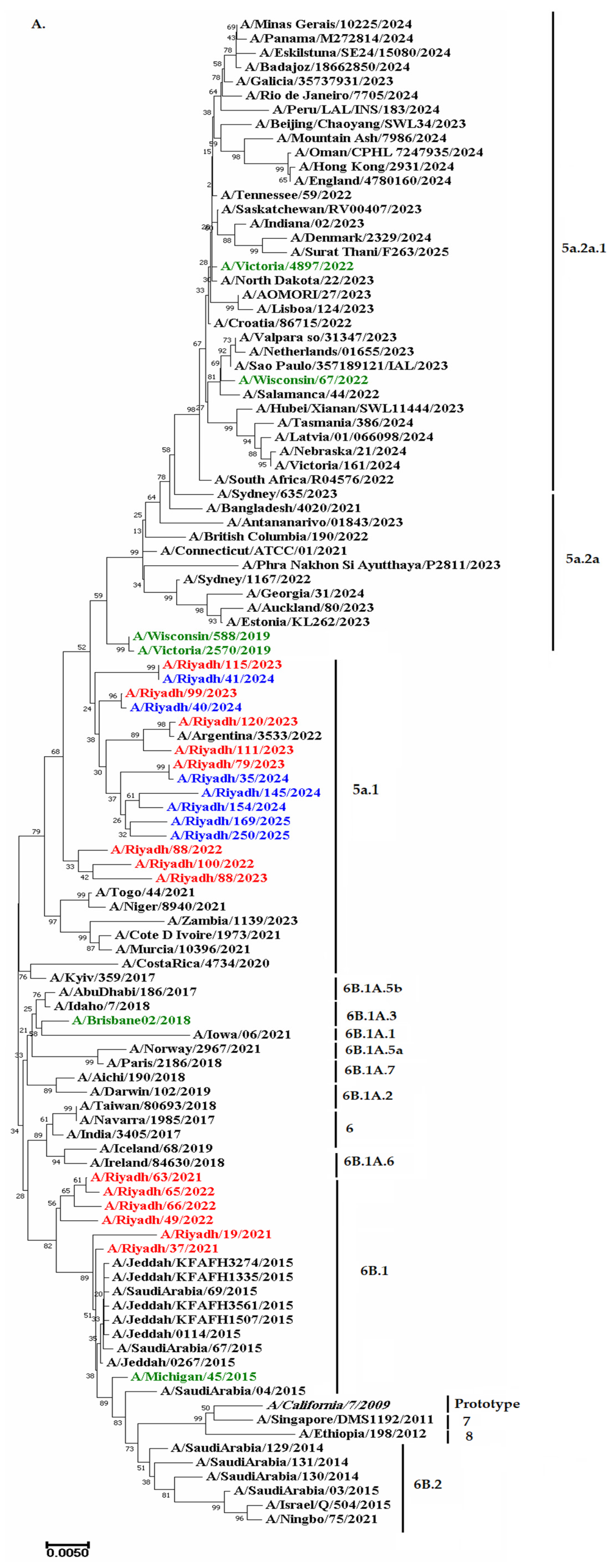 - Abdulgader, S.A.; Abdulwahed, A.M.; Almuqrin, A.M.; Aziz, I.M.; Alkubaisi, N.A.; Aljowaie, R.M.; Farrag, M.A.; Alhetheel, A.F.; Abdulmanea, A.A.; Alanazi, F.N.; et al. Genetic Divergence of H1N1pdm09 in Saudi Arabia: Unveiling a Novel N-Glycosylation Site and Its Role in Vaccine Mismatch. Vaccines 2025, 13, 1111. [Google Scholar] [CrossRef] [PubMed]