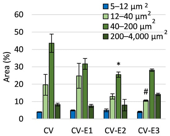The comparison of area features as a morphological characteristic of the studied sorbents obtained using flow cytometry. Values are the mean ± SEM; *, #—significant difference compared with CV and CV-E1 groups, respectively, at p < 0.05 (Kruskal–Wallis, post hoc Dunn’s test).