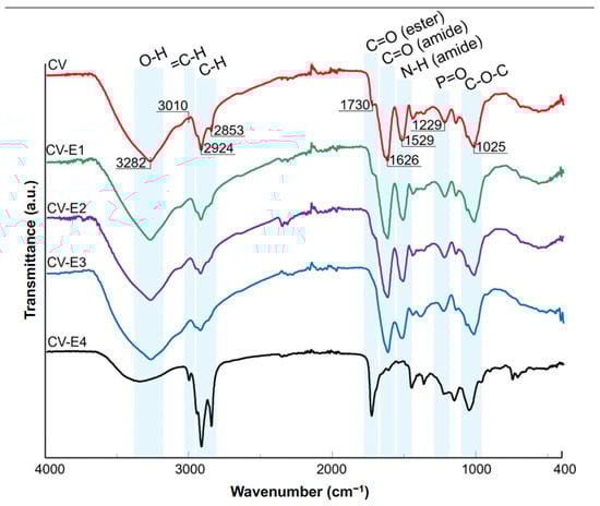 The ATR-FTIR results of CV, CV-E1, CV-E2, and CV-E3 samples, together with the spectrum of sample extract (CV-E4), are presented in Figure 4. The spectrum of intact Chlorella vulgaris sample (CV) revealed the dominant bands at 3282, 2924, 1626, 1529, 1229, and 1025 cm−1 characteristic for O-H stretching, aliphatic C-H stretching, C=O stretching (amide I of proteins), N-H bending (amide II of proteins), P=O stretching (phosphodiesters of nucleic acids), and C-O-C stretching modes of polysaccharides, respectively [42,43]. The band at 1025 cm−1, present in the CV-E4 sample extract, can be explained by polysaccharide residual particles in the sorbent that remained after extraction. In the case of lipid extraction, two additional bands at 3010 (=C-H stretching) [44] and 1730 cm−1 (C=O stretching of esters) [42] were of particular interest. The intensities of these bands decreased significantly in the spectra of samples after extraction (Figure 4, CV-E1, CV-E2, and CV-E3), whereas their strong presence in the spectrum of sample extract (CV-E4) was reported. These observations proved the successful extraction of lipids from intact Chlorella vulgaris material. These findings were in agreement with other studies that focused on the determination of lipid content obtained from algae [42,44]. Interestingly, similar results were reported not only for algae samples but also for fungal biomasses after lipid extraction [45].