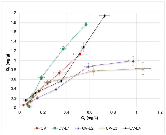Adsorption isotherms of DCF for investigated sorbents (CV, CV-E1, CV-E2, and CV-E3), together with data obtained for sample extract (CV-E4). Horizontal and vertical error bars denote standard deviations of Ce and Qe, respectively.