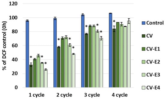 Chlorophyll autofluorescence at Ex = 488 nm (detected band 640–745 nm) showed significant decrease in relative fluorescence intensity (1000–50,000 a.u.) after solvent extraction (CV-E2), mainly due to the removal of lipophilic pigments (Figure S8). A similar trend of relative fluorescence intensity reduction (50–50,000 a.u.) observed in the CV-E1 and CV-E3 groups also may be attributed to chlorophyll loss during extraction [37,38].