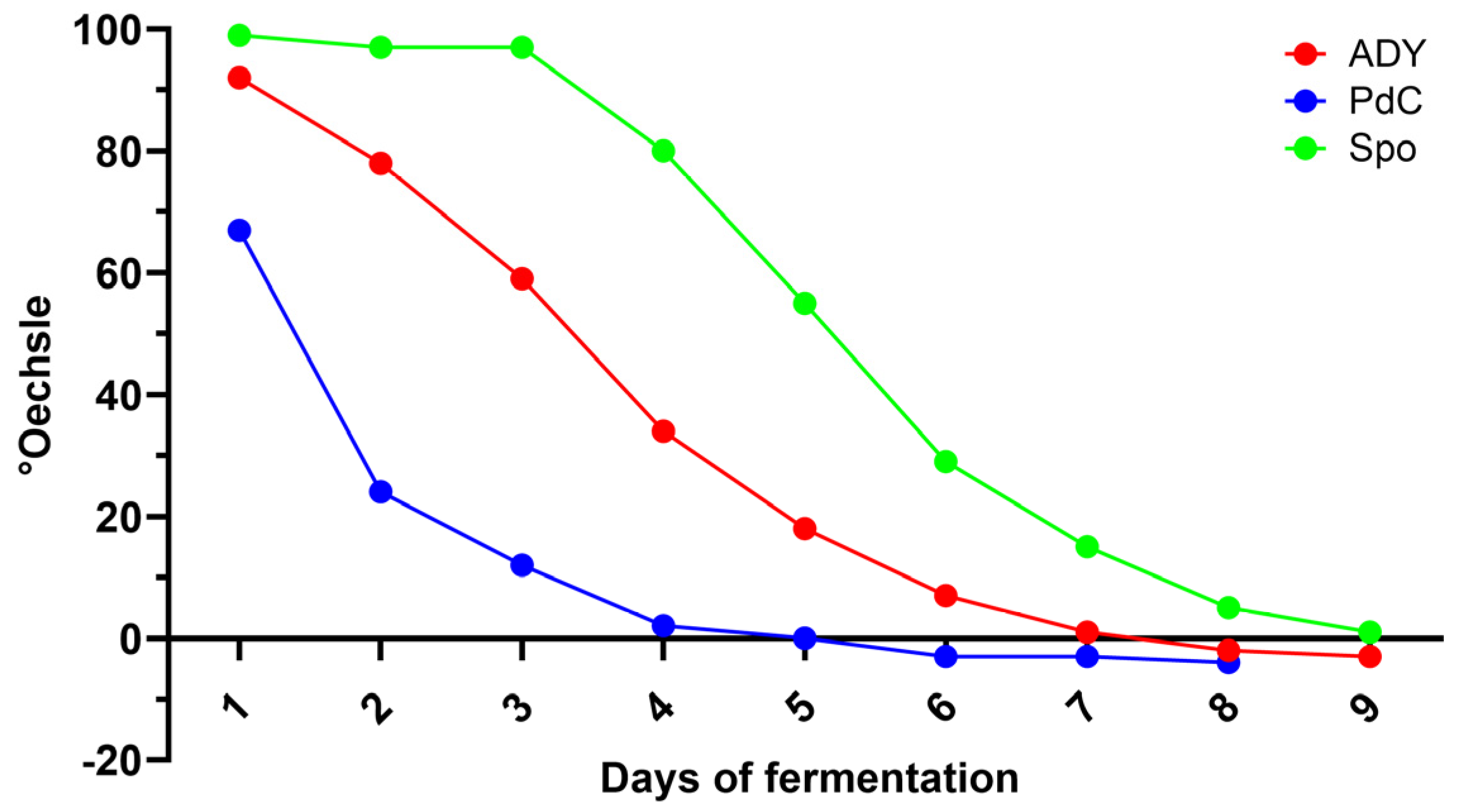 Pinot Noir grapes (about 800 kg) from the Grand-Brulé domain of Leytron (Wallis Canton, Switzerland) were harvested and processed on 20 September 2024. After destemming and crushing, the grapes were divided into three tanks (240 kg/tank), corresponding to the condition Active Dried Yeast (ADY), Pied-de-Cuve (PdC) and spontaneous fermentation (Spo). The ADY condition was inoculated with Lalvin RC212 (Lallemand, Montreal, QC, Canada) at a concentration of 20 g/hL. For the PdC condition, the starter was prepared by harvesting and processing 30 kg of grapes one week before the official harvest. Ten mg/L of SO2 was added to favor fermentative yeasts. The spontaneously fermenting must (with a densitometric value of 40° Oechsle) was added to the PdC tank at an approximate ratio of 1:10, concomitant with ADY inoculation. Spo fermentation was left not inoculated. The tanks were kept closed and were open only once per day to manually mix the grapes and sample the juice in fermentation. To compensate for the low content of yeast assimilable nitrogen in the musts, which was approximately 120 mg/L, 13 g/hL of diammonium phosphate, resulting in 30 mg/L of yeast assimilable nitrogen, was added to each tank on day 1.