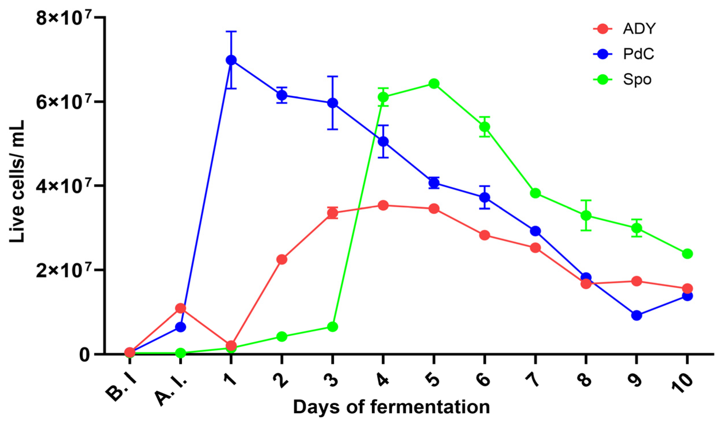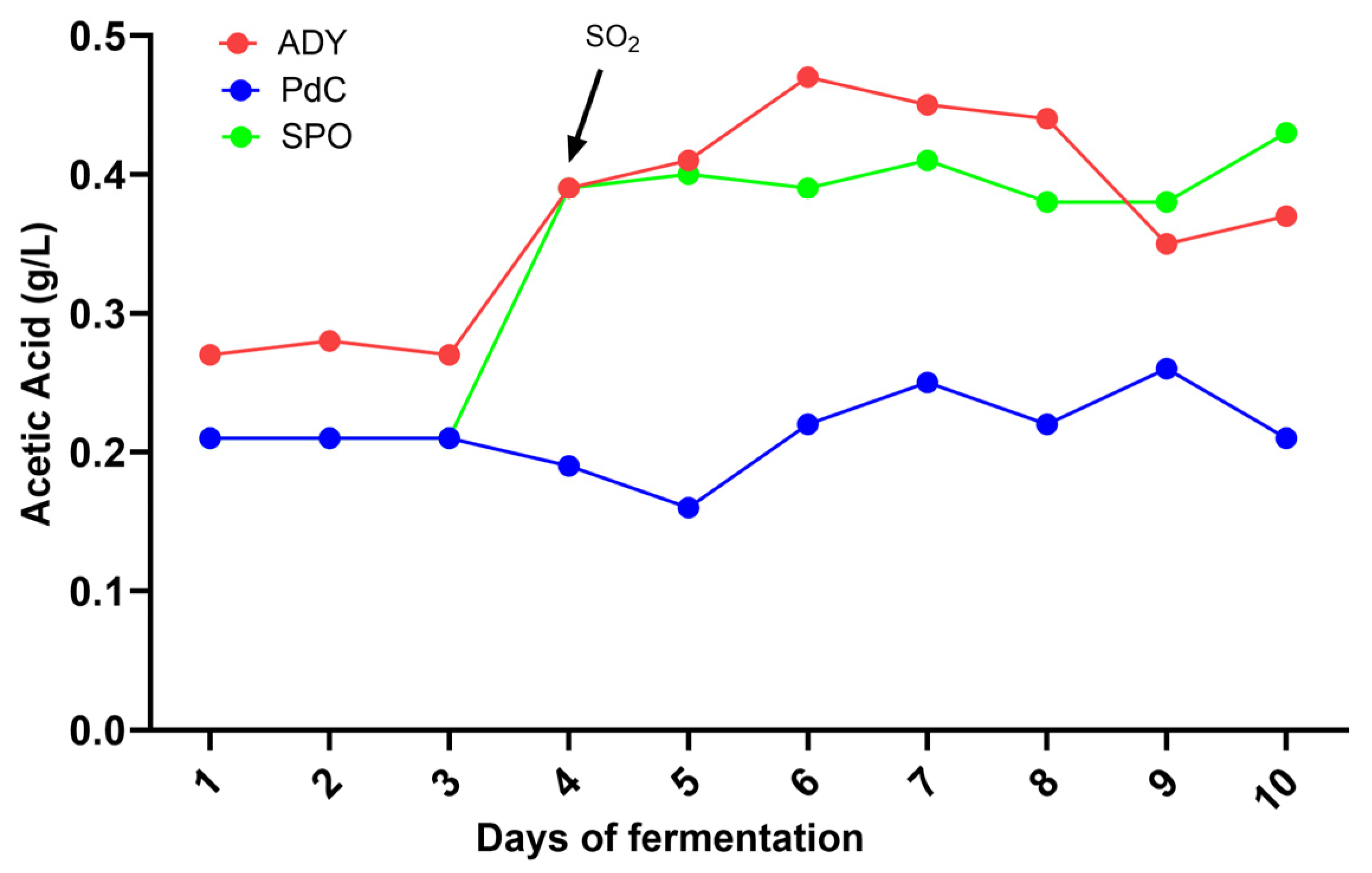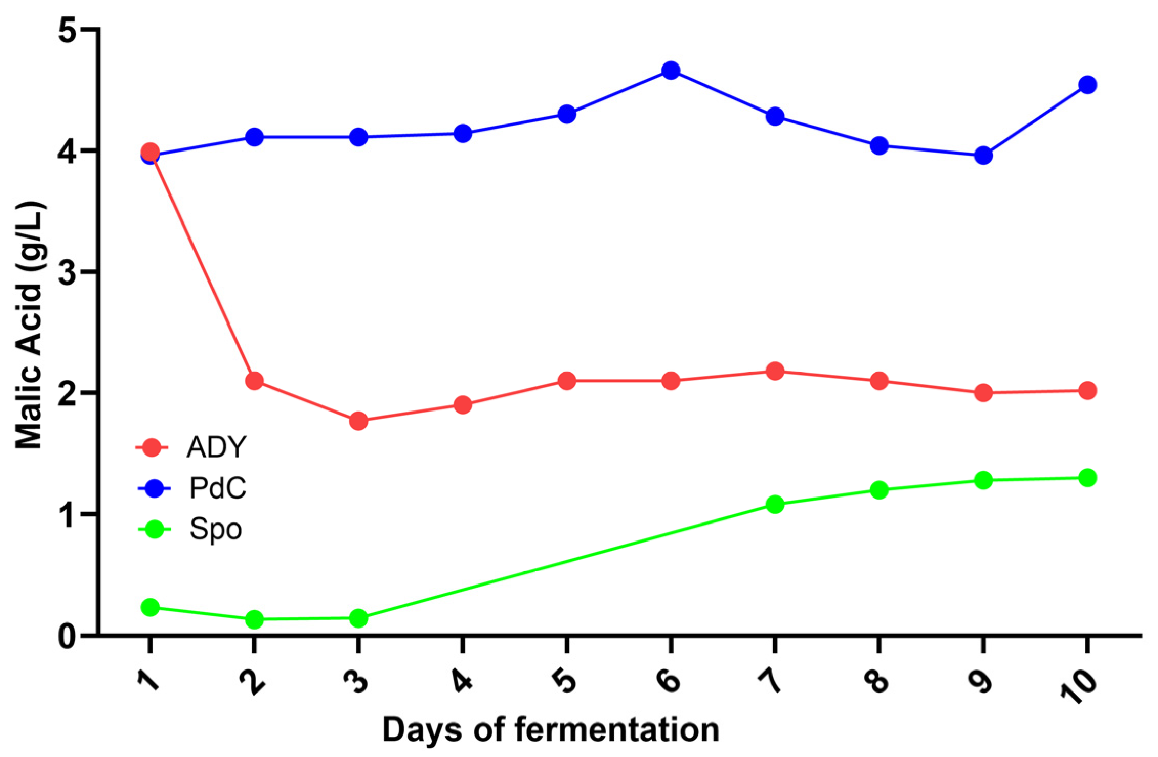The temporal association between bacterial viability, early malic acid decrease, and acetic acid accumulation suggests a potential contribution of bacterial activity during the initial fermentation stages in the ADY and Spo conditions. The presence of acetic acid in both ADY and Spo, coupled with the fact that
