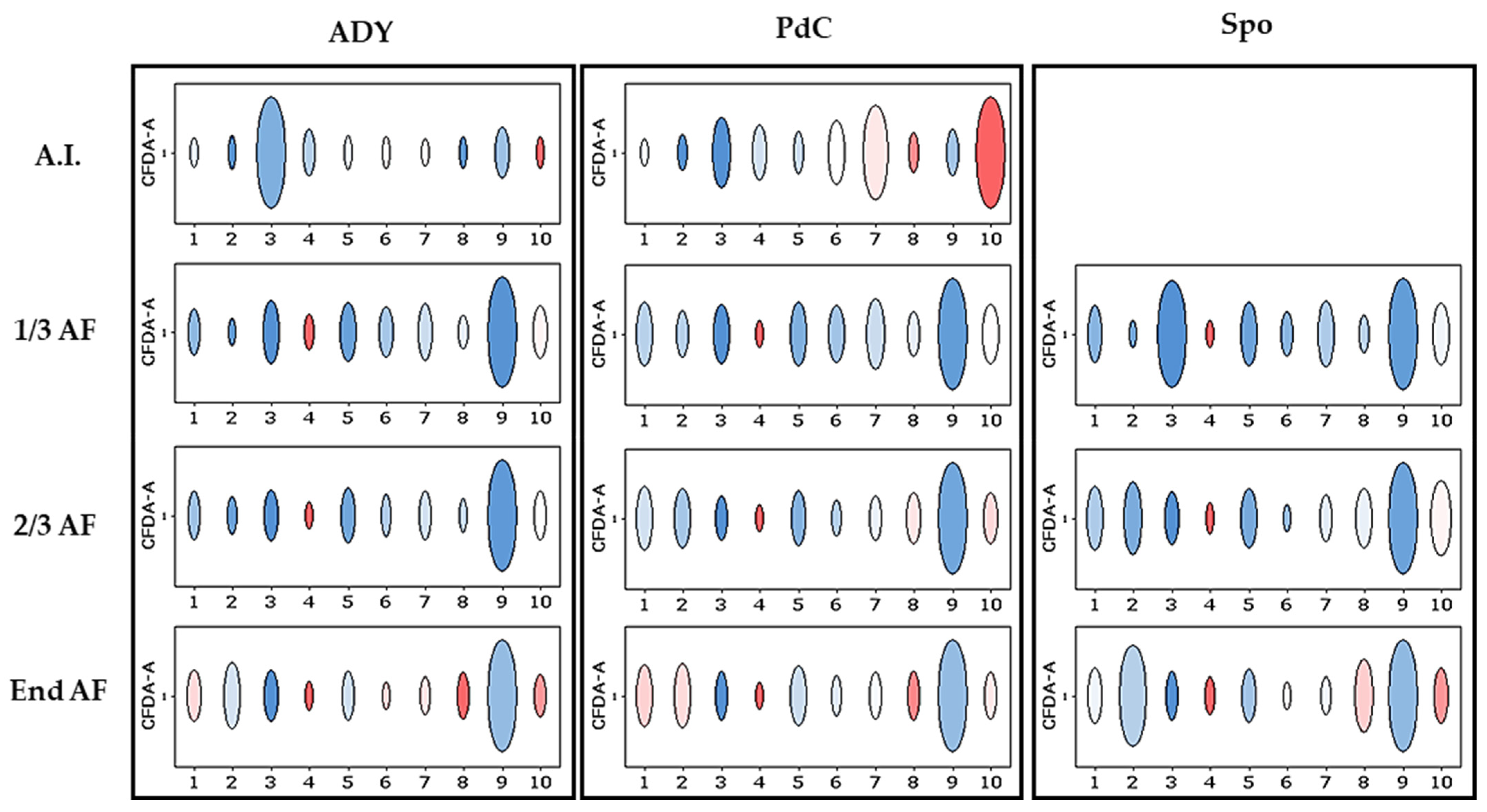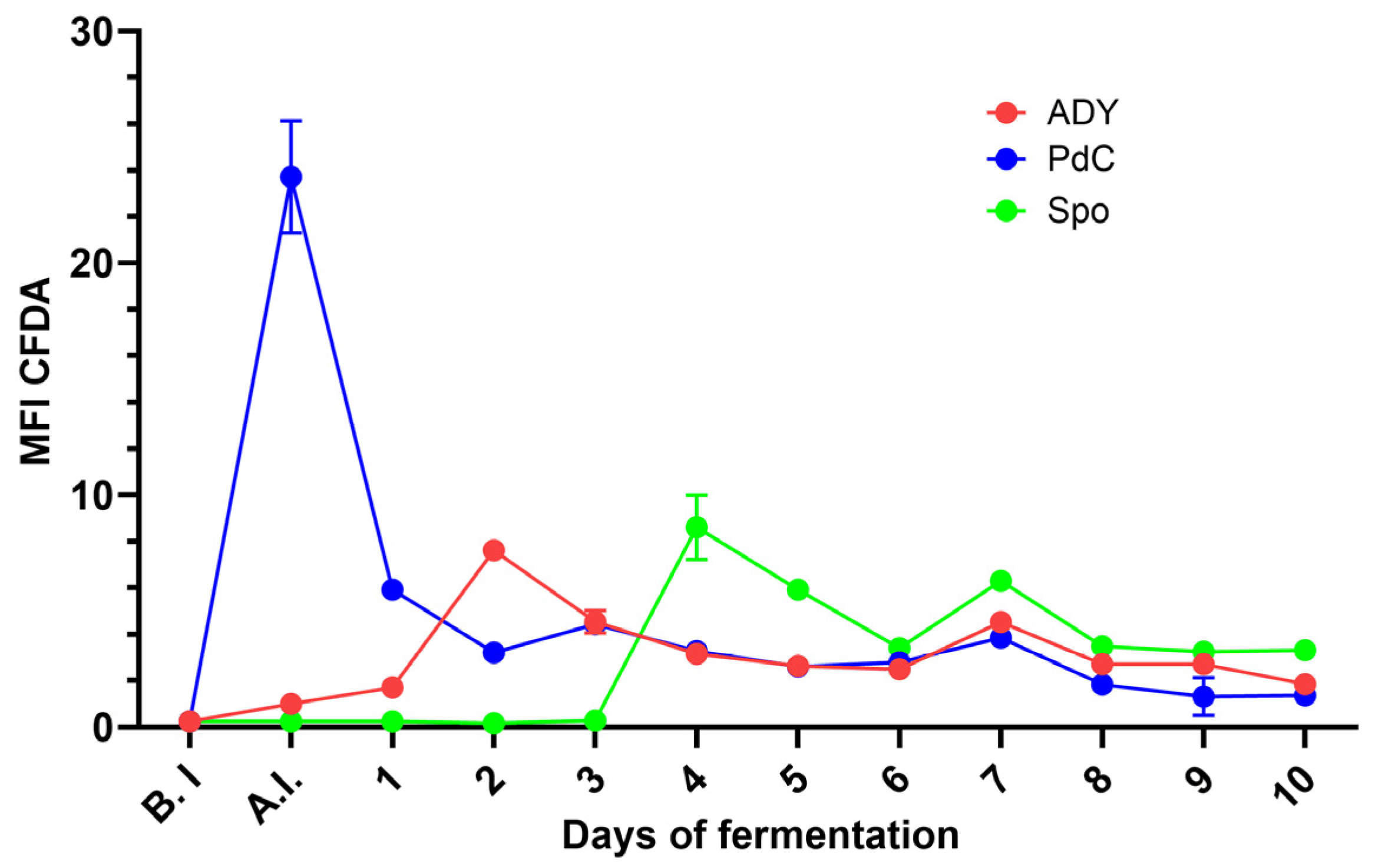 18]. The CFDA-based metabolic activity profiles reinforce this view: PdC exhibited a marked metabolic peak at inoculation, whereas ADY and especially Spo showed more gradual and fluctuating activation, with Spo only reaching higher CFDA values after several days. These observations show that FCM can capture not only quantitative changes in yeast populations but also qualitative transitions in the physiological state that precede or accompany shifts in the fermentation rate.