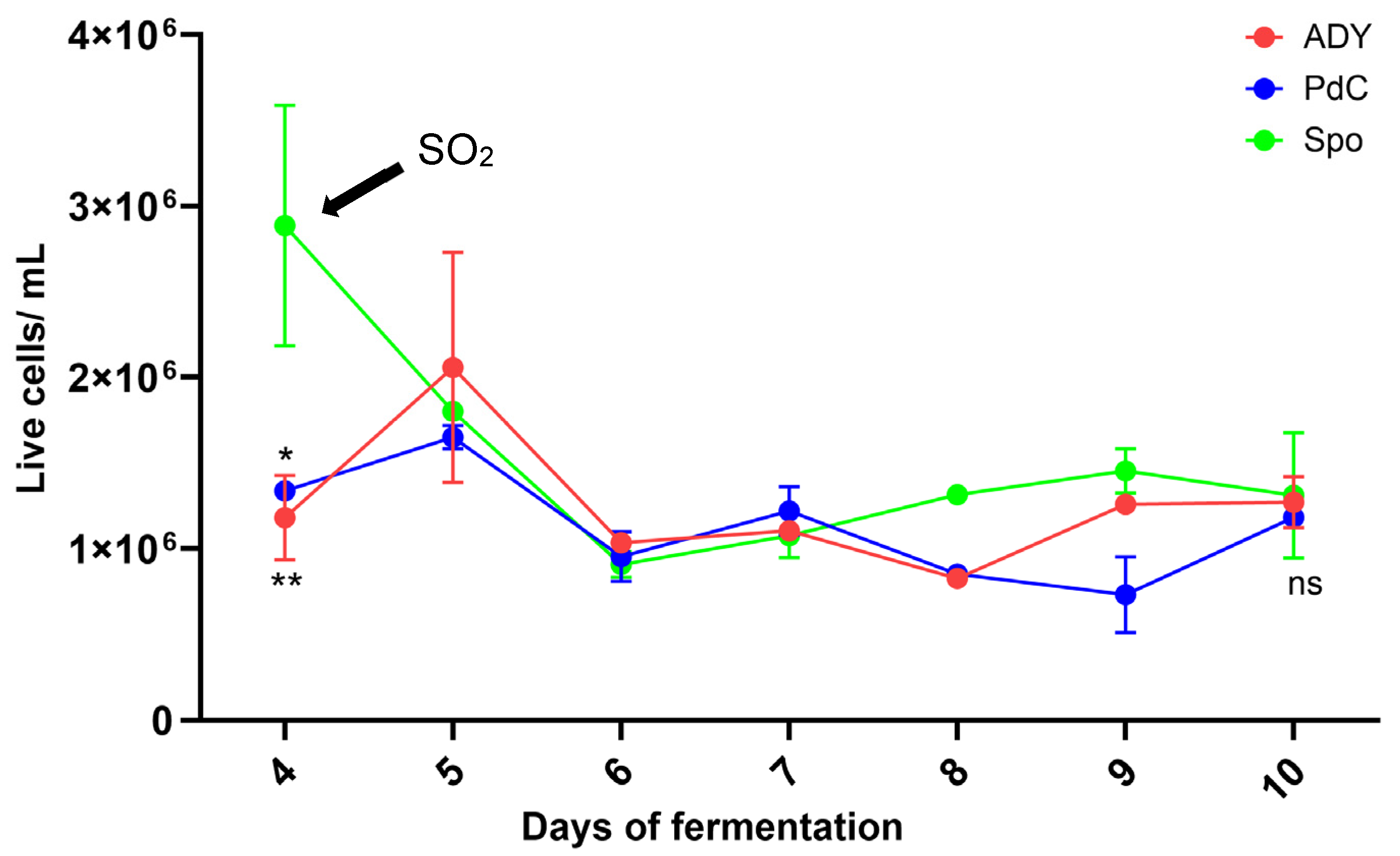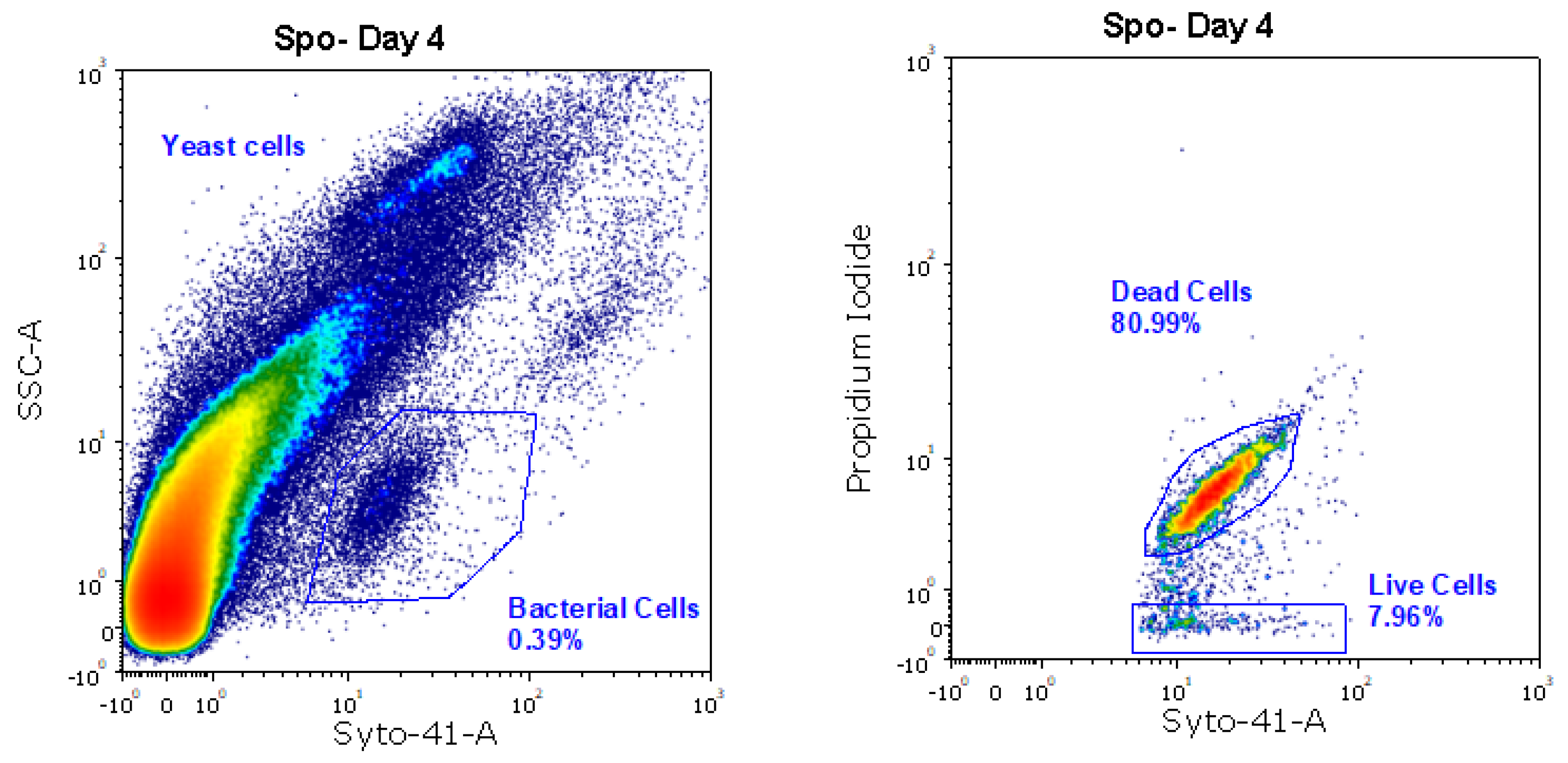 12]. A key advantage of FCM lies in its short turnaround time, typically around 20 min, including sample preparation, staining, and data acquisition. This may allow for the rapid identification of stress conditions, shifts in population structure, or early signs of contamination, thus facilitating timely intervention in cellar. Such rapidity is particularly valuable in Spo, in which the absence of active dry yeast (ADY) inoculation results in a process that relies entirely on indigenous microbiota [