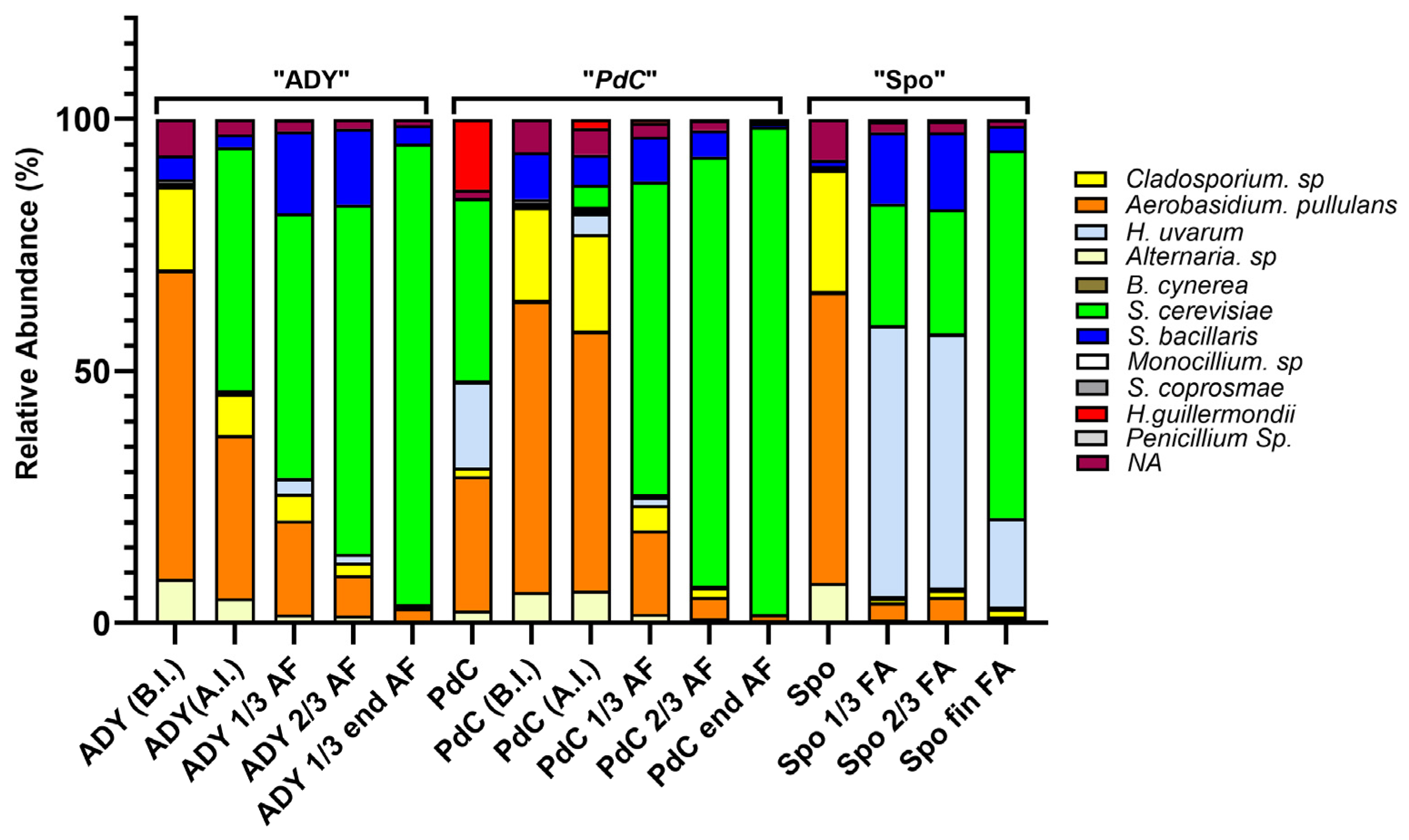 Cladosporium spp., likely reflecting the microbiota present on the grapes and in the must. After the addition of ADY or PdC,