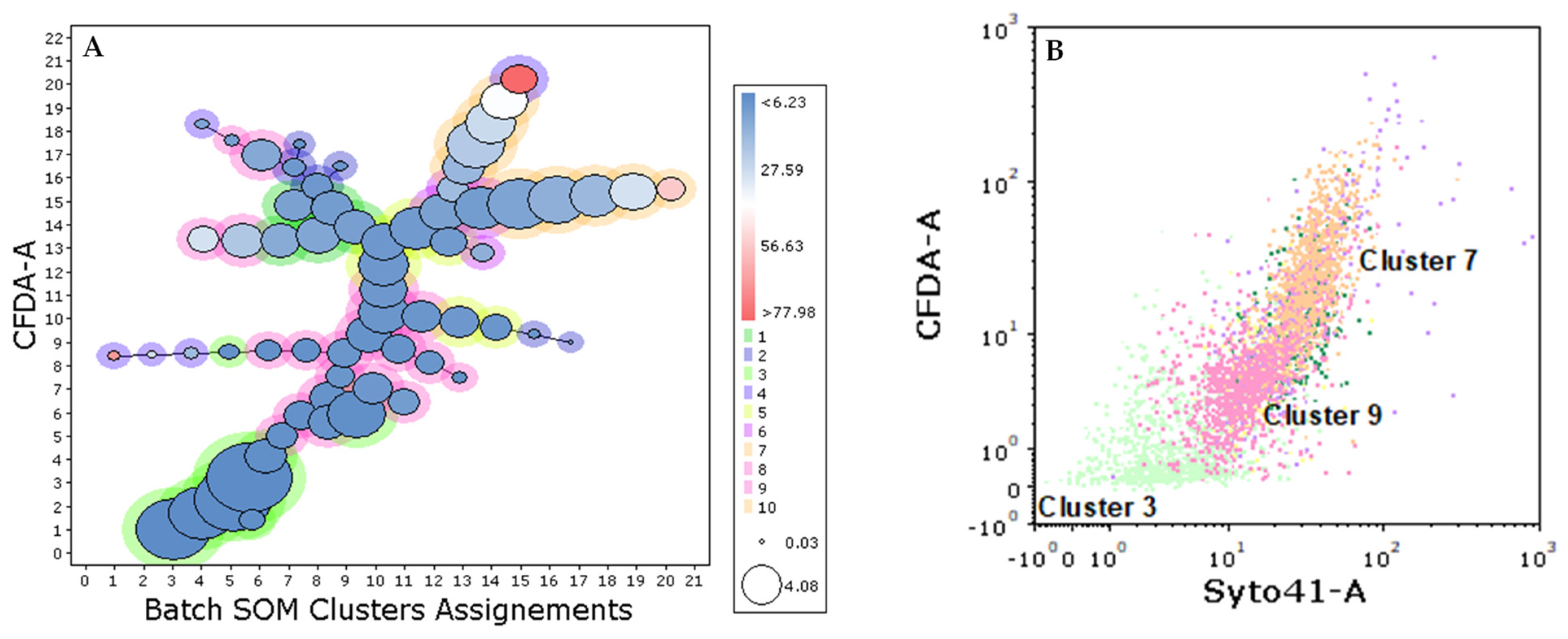 Supplementary Figure S1 illustrates a general gating strategy. The parameters analyzed included the cell count (expressed as live cells/mL) and the relative fluorescence intensity of CFDA (expressed as median fluorescence intensity [MFI]), a general indicator of the metabolic activity of the cell. Unsupervised analysis was carried out using FCS Express v 7.28.0035 (Dotmatics, Boston, MA, USA) implementing the FlowSOM algorithm. FlowSOM applies a self-organizing map (SOM) to group cells based on phenotypic similarity, followed by hierarchical consensus clustering to define metaclusters (10 in this experiment). Parameters included Syto-41 and CFDA fluorescence, forward and side scatter (hyperlog-transformed), an 8 × 8 SOM grid, and downsampling to 4000 events within the live-cell gate.