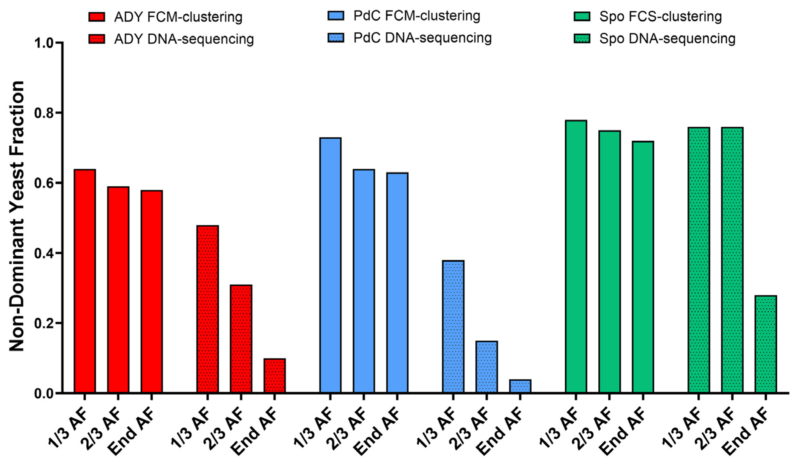 S. cerevisiae. In PdC, several metaclusters were initially detected, followed by a progressive convergence toward a dominant phenotype, whereas Spo maintained a more heterogeneous profile for a longer portion of fermentation. This pattern is in line with the higher microbial complexity observed in Spo by DNA sequencing, suggesting an association between yeast diversity and phenotypic heterogeneity. Consistently, a comparison of the non-dominant fraction derived independently from sequencing and FCM indicated that Spo retained a higher contribution of non-dominant yeasts, compared to ADY and PdC, throughout fermentation, reflecting delayed community convergence. However, under the staining conditions employed, direct assignment of metaclusters to specific yeast species was not possible. In this context, the development of yeast-specific antibodies or molecular probes—currently limited in oenological applications [
