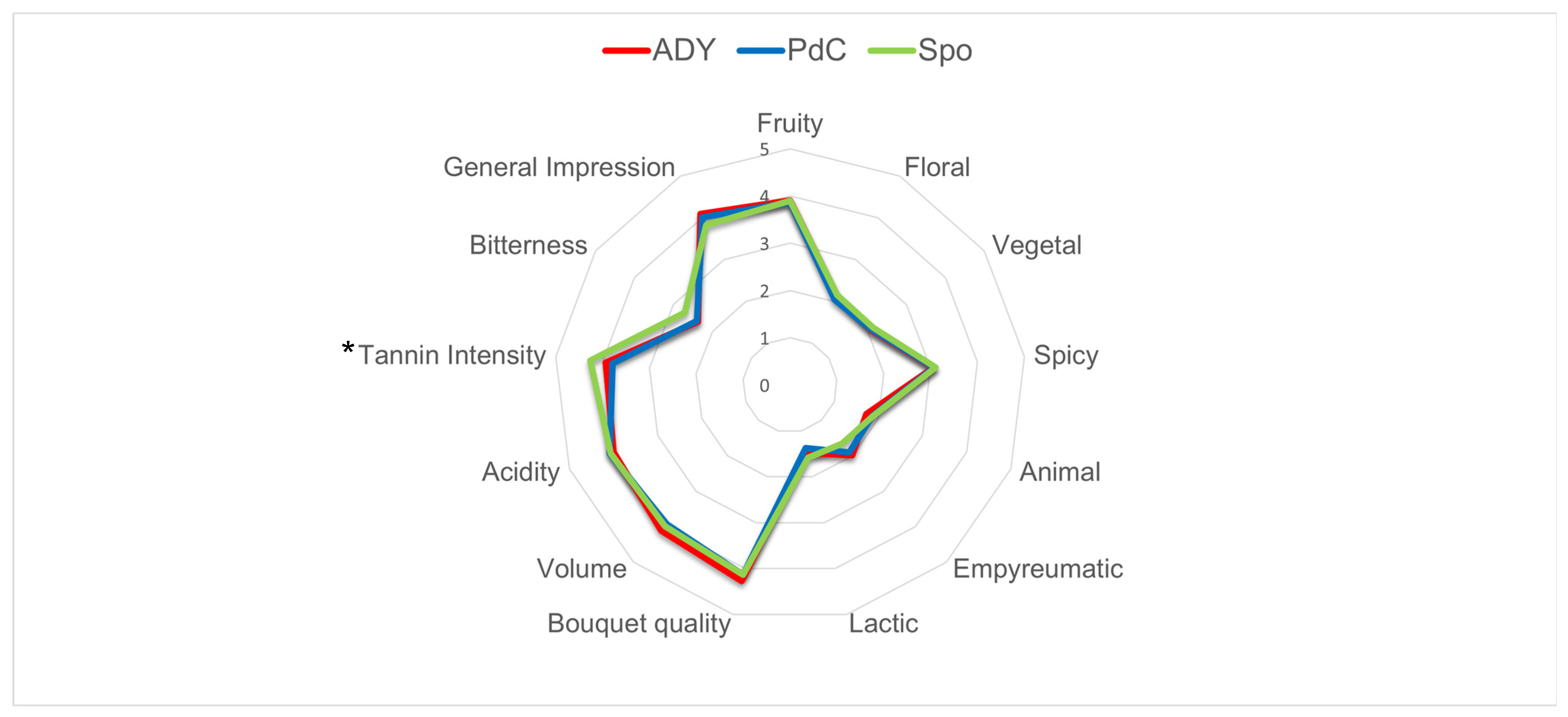 Sensory analysis revealed no significant differences among the three wines; however, the Spo condition showed higher perceived tannin intensity compared to the ADY and PdC. The potential involvement of non-