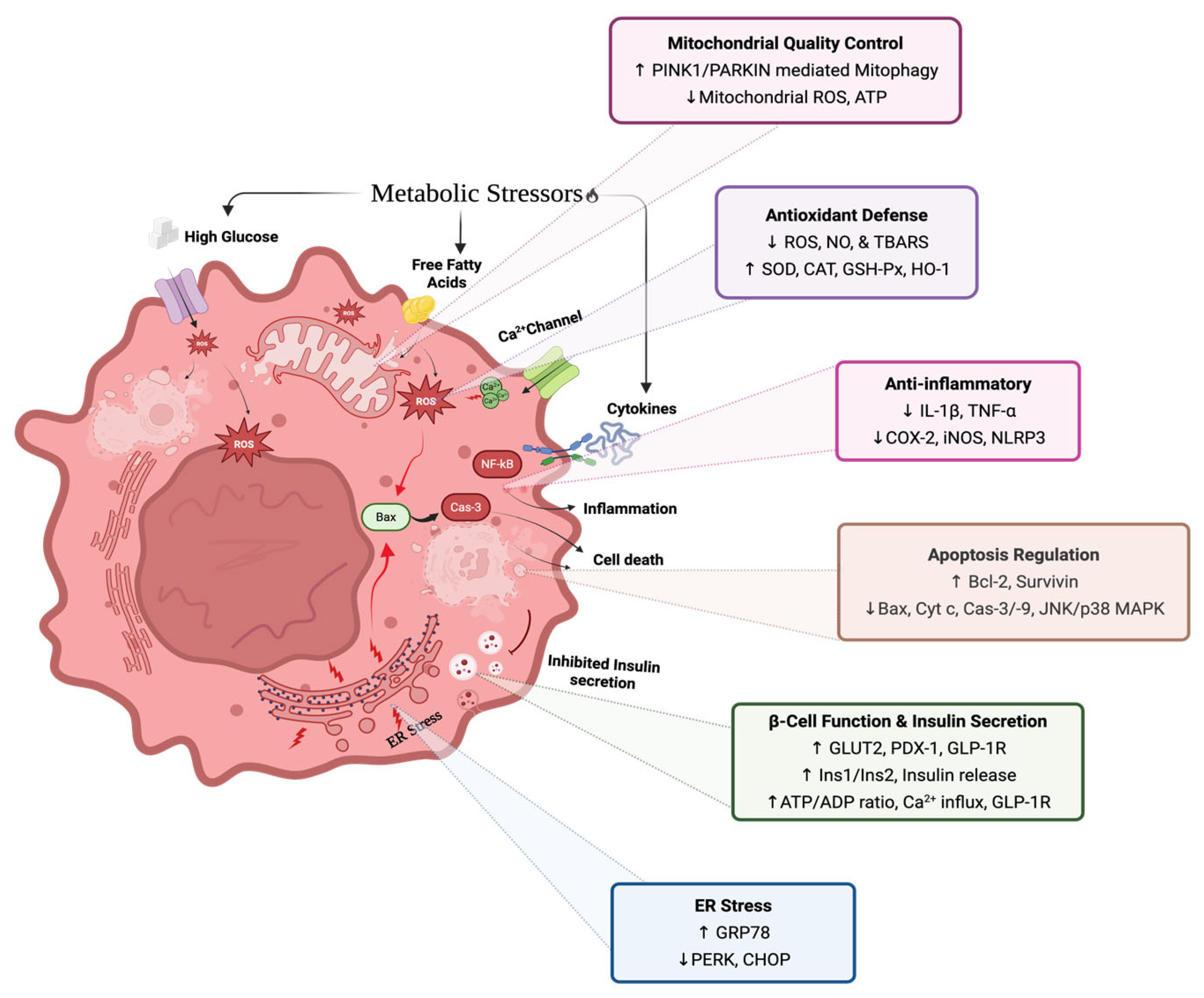 - Dludla, P.V.; Mabhida, S.E.; Ziqubu, K.; Nkambule, B.B.; Mazibuko-Mbeje, S.E.; Hanser, S.; Basson, A.K.; Pheiffer, C.; Kengne, A.P. Pancreatic β-Cell Dysfunction in Type 2 Diabetes: Implications of Inflammation and Oxidative Stress. World J. Diabetes 2023, 14, 130–146. [Google Scholar] [CrossRef]