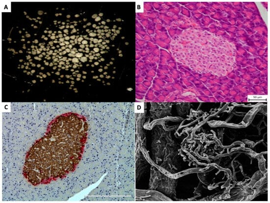 Each endocrine cell is in direct contact with a capillary wall, and the density of the capillary network within the islets is 5- to 10-fold greater compared to surrounding exocrine tissue. Its specific structure varies depending on islet size [9]. In small islets (diameter < 160 µm), the capillaries are integrated with the exocrine capillary network, forming a glomerulus-like insulo-acinar system. In contrast, large islets (diameter > 250 µm) are typically supplied by 1 to 5 arterioles originating from intralobular arteries. These arterioles branch into dense fenestrated capillaries—comprising approximately 7–8% of the islet volume—which drain directly into venules, forming an insulo-venous system [7,9,10]. A representative example of large islet microvasculature is illustrated in Figure 1D, using scanning electron microscopy of a corrosion cast [9].