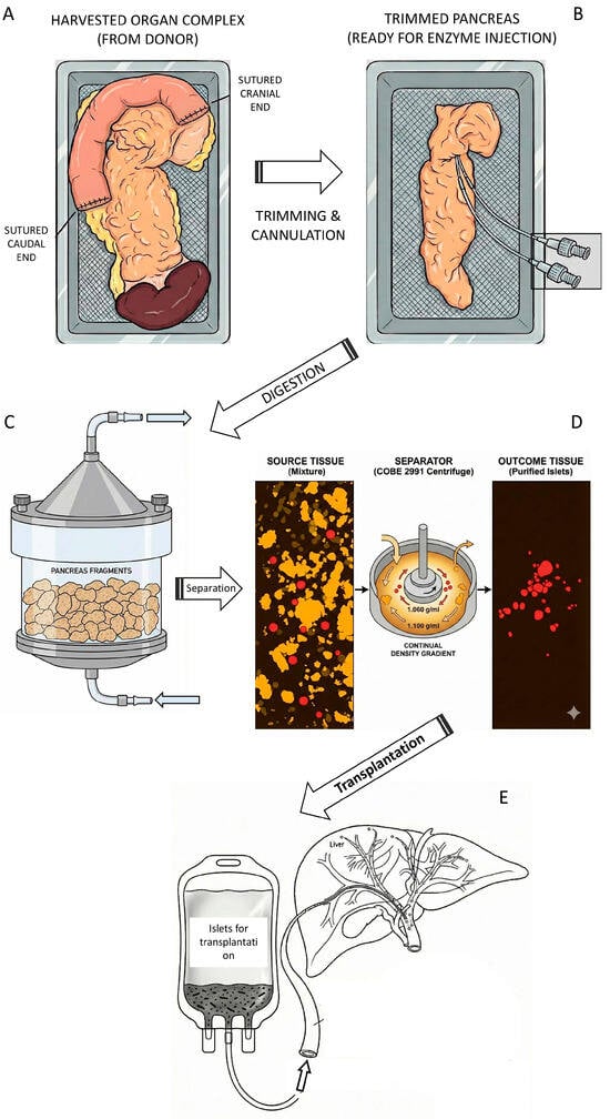 Schematic illustration of islet isolation process (this picture was created with the Gemini 3 Pro AI according to prompts of the corresponding author). (A) The pancreas was harvested from a cadaveric donor along with a segment of the duodenum and the spleen. To reduce the risk of contamination transfer from intestinal content, the duodenum was flushed with betadine solution and sutured at both ends. (B) The trimmed pancreas was cut in the neck segment and two catheters were inserted allowing instillation of enzymatic solution (mostly collagenase + neutral protease). (C) The distended pancreas was cut into small pieces and transferred to Ricordi chamber, a part of the digestive circuit. Under the cup of chamber there is a mesh with the holes 500 µm allowing circulation and collection of tissue pieces not larger than this size. (D) Collected tissue is spun in the density gradient (often Ficoll®) and islets are separated from exocrine tissue. The total tissue volume of 60 mL is typically reduced to 1–2 mL of purified islets. (E) Separated islets could be directly transplanted. The graft transferred to infusion bag is ready for transplantation. The catheter can be inserted in interventional radiology department through the 9th intercostal space to the portal vein.