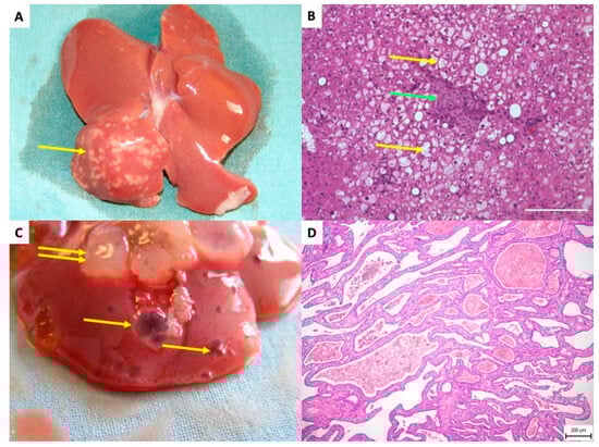 Rat liver after transplantation of pancreatic islets–delayed side effects. (A) The white dots in right liver lobes are related to a focal steatotic lesions spatially connected to islet grafts—10 months after transplantation. Yellow arrow indicates the focal steatotic lesion. (B) Detail microscopic examination of the same lesion as in (A). The yellow arrow indicates so-called foam cells (hepatocytes full of lipid particles). Green arrow indicates islet graft. (C) Macroscopic view of cystic liver lesions surrounding transplanted islets. Single yellow arrows indicate simple cysts; double arrows indicate complex polycystic lesions. (D) Microscopic picture, Hematoxillin Eosine. Polycystic lesion showing septa with cuboid cholangiocyte epithelial cells outlining the lesions.
