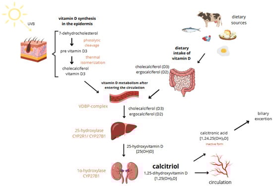 Vitamin D, a fat-soluble vitamin essential for calcium absorption, bone mineral regulation, and muscle function, exists in two main forms: vitamin D2 (ergocalciferol) and vitamin D3 (cholecalciferol). While D2 is derived from plant sources and added to foods due to the body’s inability to synthesize it, D3 is produced in the skin through sunlight exposure, making cutaneous synthesis its main source. However, it can also be obtained from certain foods such as fish, beef liver, egg yolk, and cheese, as well as from supplements. Both vitamin D3 oral intake and sun exposure aim to achieve relevant vitamin D levels. Vitamin D3 is more potent than D2 and is typically preferred for treating deficiencies, used as a supplement [16]. It is said that the Earth’s population generally has low vitamin D levels [17]. Sun exposure up to about 25% of the skin surface—such as the face, hands, and arms—at a quarter of the minimum erythemal dose (MED) can generate approximately 1000 IU of vitamin D, while full-body exposure for 15 min at midday in summer may yield up to 10,000 IU. However, the efficiency of vitamin D synthesis varies widely depending on factors such as age, skin pigmentation, time of day, geographic location, weather, season, clothing, and sunscreen use [18]. In old age, cutaneous synthesis of vitamin D can be reduced to as little as 25%. Combined with a decline in the kidneys’ ability to hydroxylate vitamin D, this can lead to significant deficiencies [19]. The great majority of vitamin D3 is synthesized endogenously in the epidermal keratinocytes following exposure to ultraviolet B (UVB) radiation. It induces photolytic cleavage of 7-dehydrocholesterol to pre-vitamin D3. This unstable intermediate undergoes thermal isomerization to form cholecalciferol, which then enters circulation bound to vitamin D-binding protein (VDBP). Excessive vitamin D synthesis is self-limited by conversion of pre-vitamin D3 to inactive photoproducts (e.g., lumisterol, tachysterol), preventing vitamin D toxicity from sun exposure [20]. In circulation, vitamin D is hydroxylated in the liver to form 25-hydroxyvitamin D [25(OH)D] in mediation of CYP2R1 or CYP27B1. The major circulating metabolite has a half-life of 2–3 weeks. Subsequent hydroxylation occurs primarily in the renal proximal and distal tubules via 1α-hydroxylase (CYP27B1), producing the biologically active form, 1,25-dihydroxyvitamin D [1,25(OH)2D or calcitriol], which has a short half-life of 4–8 h [19,21]. Calcitriol exerts its effects through the intracellular vitamin D receptor (VDR), a nuclear receptor expressed in multiple tissues, including immune, bone, intestinal, kidney, and epithelial cells. Upon ligand binding, VDR heterodimerizes with the retinoid X receptor and binds to vitamin D response elements (VDREs) in target genes, modulating their transcription. The above-mentioned mechanisms lead to the inhibition of cellular proliferation, enhancement of cellular differentiation, modulation of immune activity, regulation of ROS levels, and alterations in mitochondrial function [19]. In the non-genomic pathway, vitamin D elicits rapid cellular responses by binding to membrane-associated receptor proteins such as PDIA3 (also known as 1,25D3-MARRS), which is located on both the endoplasmic reticulum and cytoplasmic sides. PDIA3 facilitates signaling cascades involved in calcium and phosphate uptake, protein folding, and modulation of second messenger systems (IP3, DAG, cAMP), ultimately contributing to the rapid activation of pathways like WNT5A [19]. The activation and degradation of vitamin D metabolites are tightly regulated by parathyroid hormone (PTH), calcium, phosphorus, and fibroblast growth factor 23 (FGF23). FGF23 downregulates renal CYP27B1 activity and enhances expression of 24-hydroxylase (CYP24A1), promoting catabolism of both 25(OH)D and 1,25(OH)2D. Magnesium serves as a critical cofactor in several enzymatic steps of vitamin D metabolism, including hepatic and renal hydroxylation, and its deficiency impairs both the bioactivation and transport of vitamin D. This reciprocal relationship between magnesium and vitamin D deficiencies may contribute to adverse clinical outcomes, such as an increased risk of fragility fractures, particularly in postmenopausal women. Extra-renal expression of CYP27B1 in tissues such as skin, breast, and macrophages can lead to ectopic production of calcitriol, contributing to pathological hypercalcemia in granulomatous diseases like sarcoidosis [19,22]. Skin synthesis and metabolism of vitamin D are shown in Figure 1.