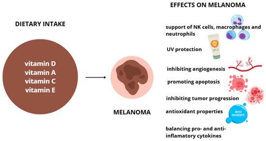Vitamin A plays a vital role in the immune system by regulating cytokine production, maintaining mucosal barrier integrity, and directing immune cell homing to mucosal surfaces. It supports the function and development of innate immune cells such as NK cells, macrophages, and neutrophils, and helps balance pro- and anti-inflammatory responses by influencing cytokines such as IL-10, IL-12, and TNF-α. Retinoic acid promotes the differentiation of regulatory T cells while suppressing proinflammatory Th1 and Th17 cells, helping to maintain immune tolerance. It also induces gut-homing markers (α4β7 and CCR9) on lymphocytes and B cells, thereby enhancing mucosal immunity and IgA production, which are essential for defending against intestinal pathogens [72,73]. Furthermore, retinoic acid (RA) plays a crucial role in melanocyte differentiation, with early exposure promotes melanocyte development from stem cells, whereas later or high-dose treatment impairs melanocyte maturation and function. In vivo, increased endogenous RA induces ectopic melanocyte differentiation via c-Kit signaling. In vitro, RA enhances melanogenesis in embryonic stem cells and melanoblasts, but suppresses it in mature melanocytes, where it inhibits proliferation, dendrite formation, and melanin production. While melanocytes can synthesize RA, expression of key RA-metabolizing enzymes such as LRAT, STRA6, and CRBP is variable, and the exact RA metabolic pathways active in melanocytes remain to be fully elucidated [66]. Summing up, vitamin A and carotenoid deficiency lead to impairment of the immune system and as a result, a higher risk of melanoma.