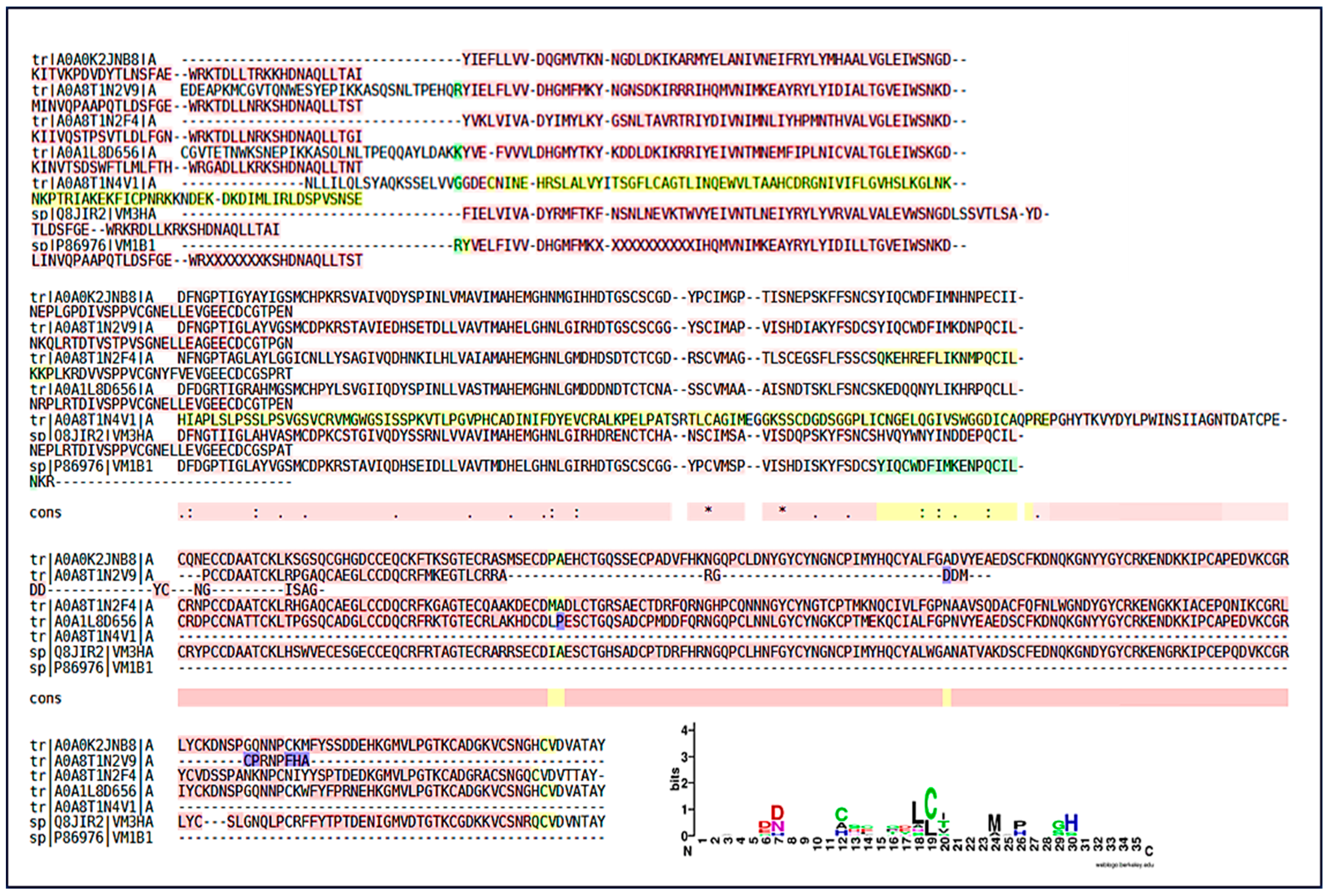 - Notredame, C.; Higgins, D.G.; Heringa, J. T-Coffee: A novel method for fast and accurate multiple sequence alignment. J. Mol. Biol. 2000, 302, 205–217. [Google Scholar] [CrossRef]
