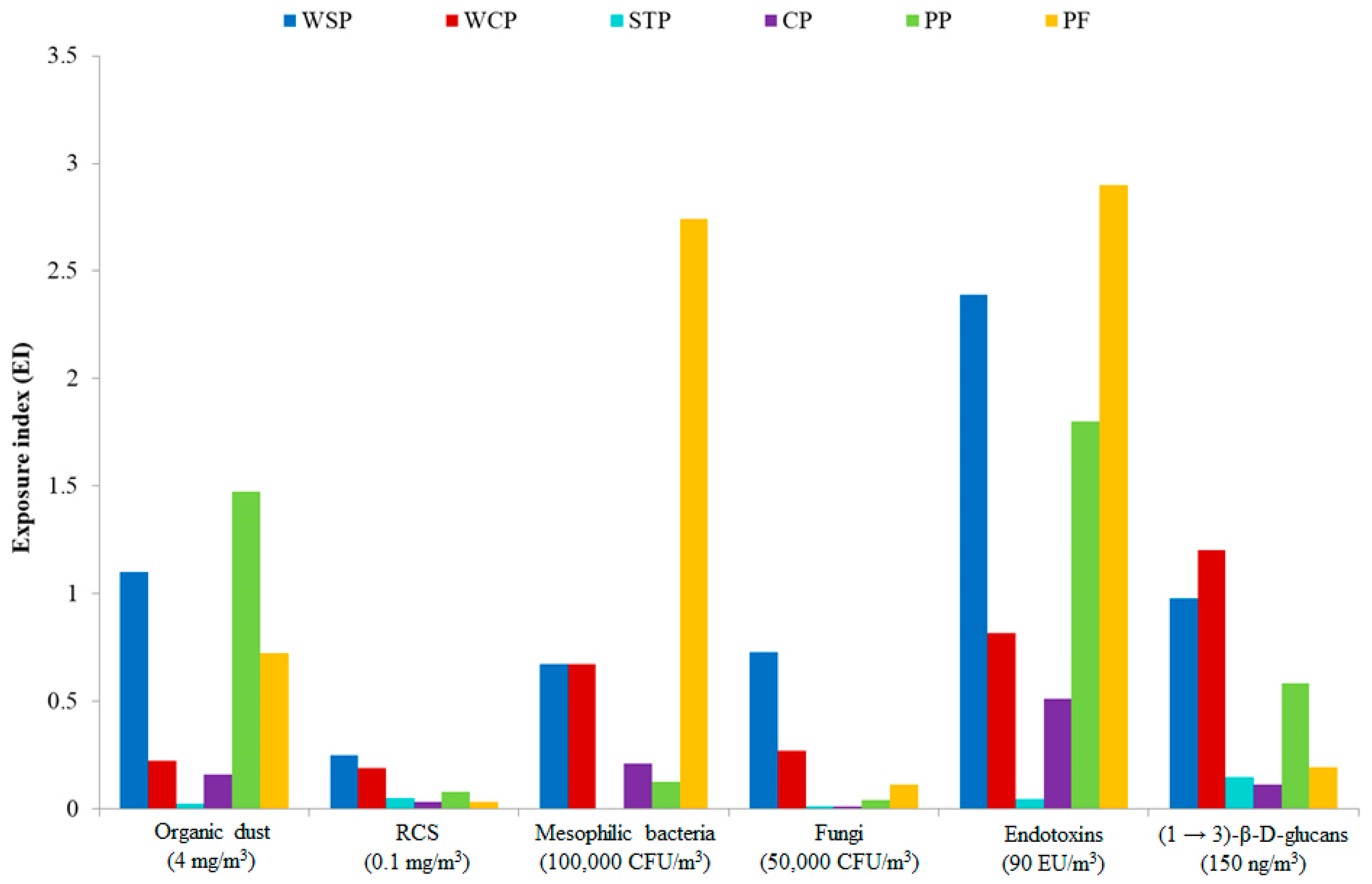 - Wouters, I.M.; Spaan, S.; Douwes, J.; Doekes, G.; Heederick, D. Overview of Personal Occupational Exposure Levels to Inhalable Dust, Endotoxin, Beta(1 → 3)-Glucan and Fungal Extracellular Polysaccharides in the Waste Management Chain. Ann. Occup. Hyg. 2005, 50, 39–53. [Google Scholar] [CrossRef]