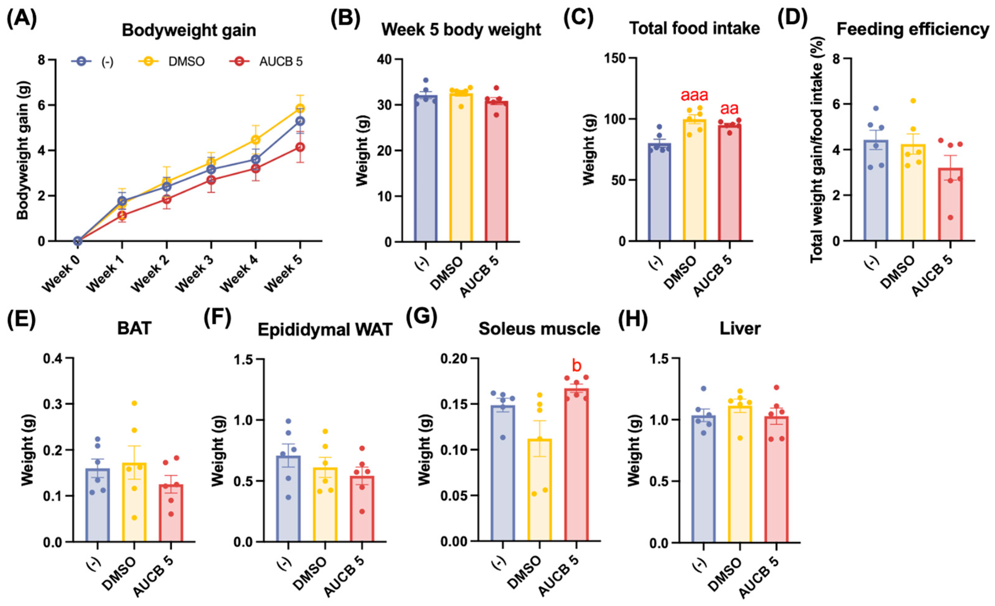 2.2. Effects of AUCB-HuBr Transplantation on Weight Gain, Feeding Efficiency, and Tissue Weights in the High-Fat-Diet-Fed Nude Mice