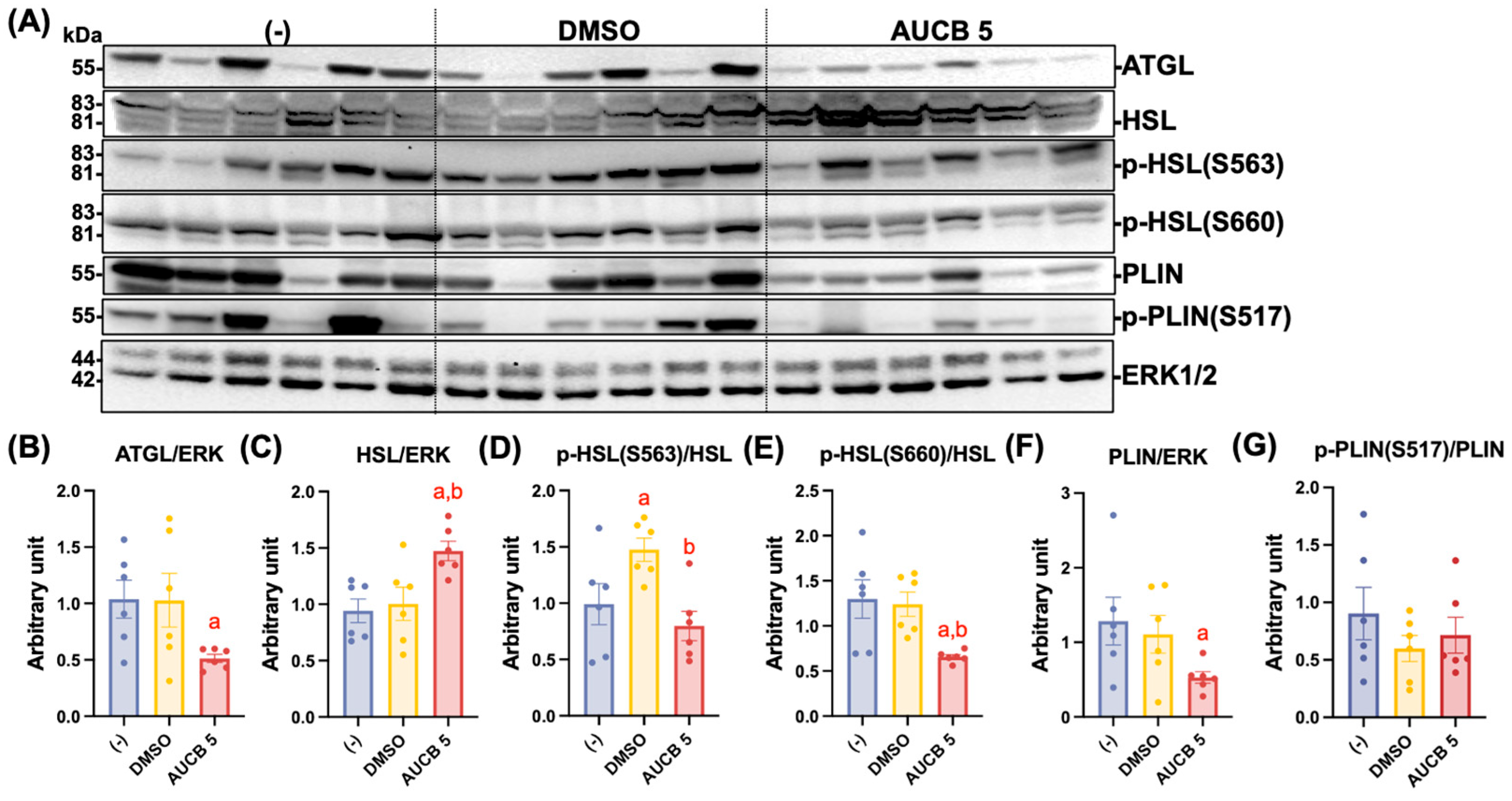 | Lipolysis Activation Antibody Sampler Kit (Antibodies for phospho-HSL (Ser 563 and Ser 660), HSL, and PLIN) | Cell Signaling Technology (Danvers, MA, USA) | 8334 |