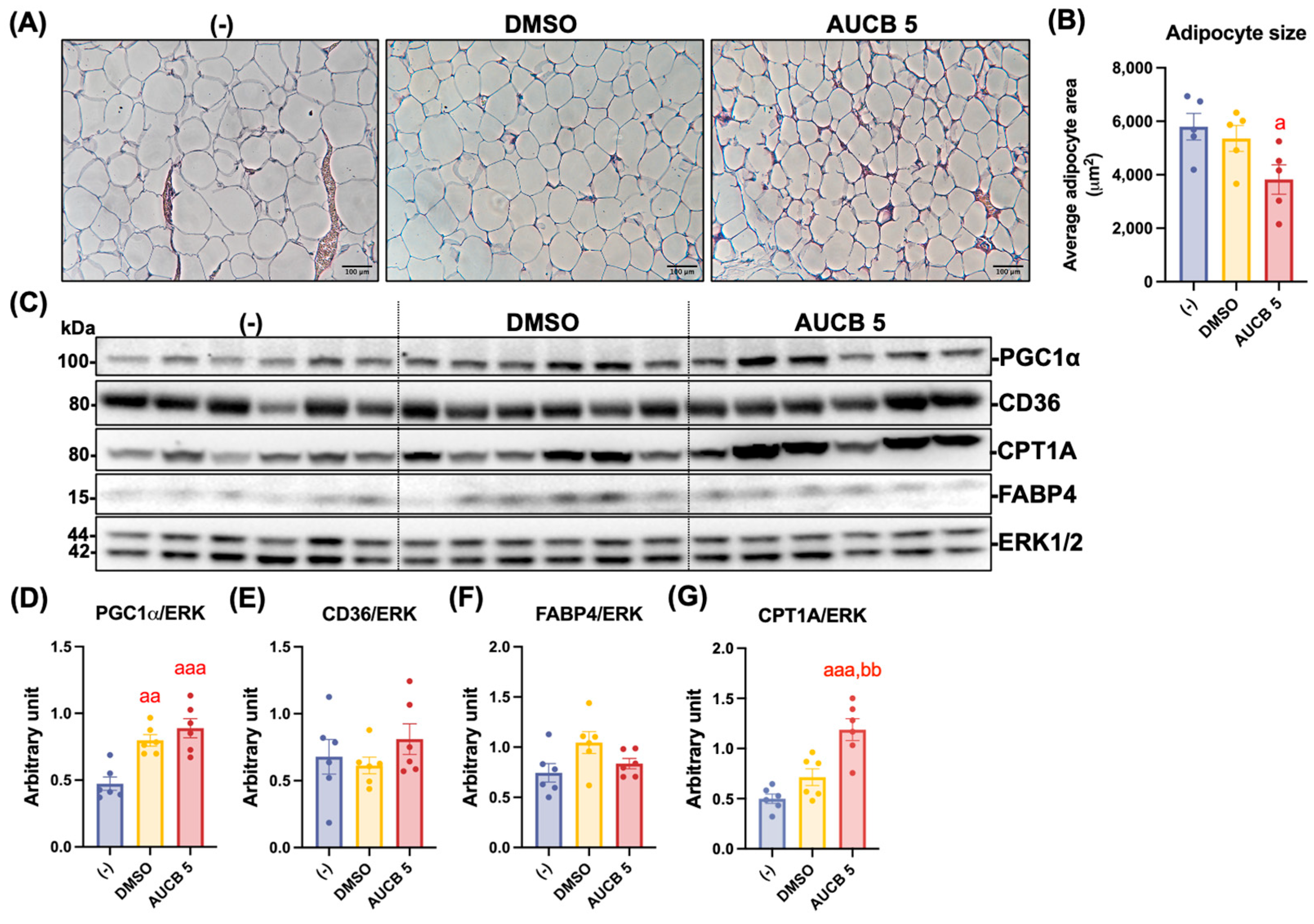 2.9. Transplantation of AUCB-HuBr Decreases Lipid Accumulation and Partially Enhances Thermogenic Protein Expression in the eWAT of the High-Fat-Diet-Fed Nude Mice