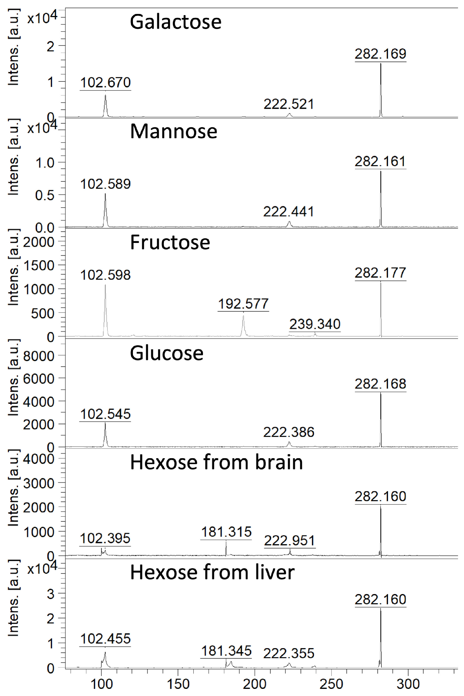 6), thus the same molecular mass, but differ in how their atoms are arranged. In the next experiment, we examined whether our method reacts differently with different hexoses. The results showed that only fructose yielded a different MS/MS spectrum. For galactose, glucose, and mannose, the resulting MS/MS spectra were the same (