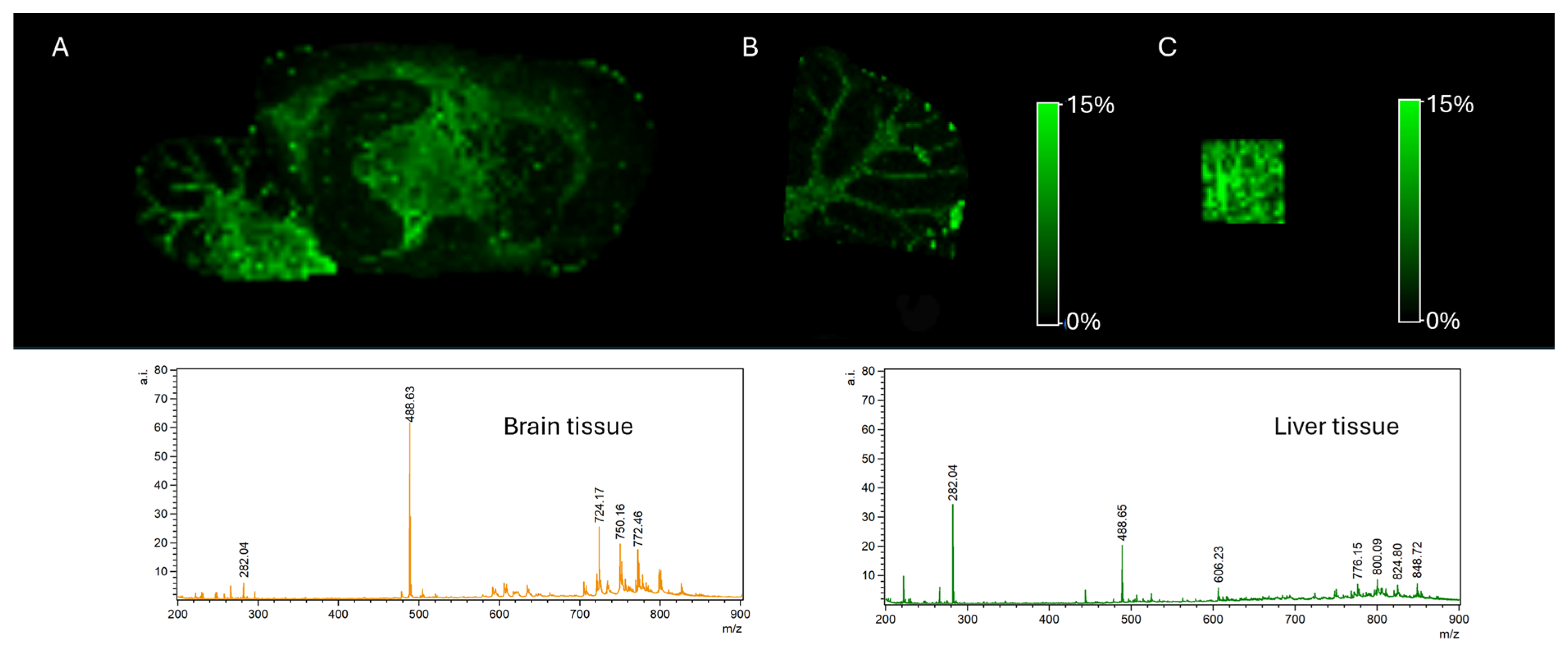 All experiments on animals were performed in accordance with the approval of the Polish and European Communities Council Directives (86/609/EEC) and were permitted by the Local Bioethics Committee for Animal Experiments at the University of Life Sciences in Lublin, approval code: 35/2020, date: 25 May 2020. In MSI experiments, only a portion of the animal tissue is typically used. The tissue is cut on a microtome at a specified location, and the residual material can be used in various ways. In our case, it was used to prepare a homogenate, which was then used to prepare a calibration curve. For method optimisation, tissues were obtained from control animals. Brains and livers were isolated and stored at −80 °C in a laboratory freezer (NU9483, NUAire Inc., Plymouth, MN, USA).