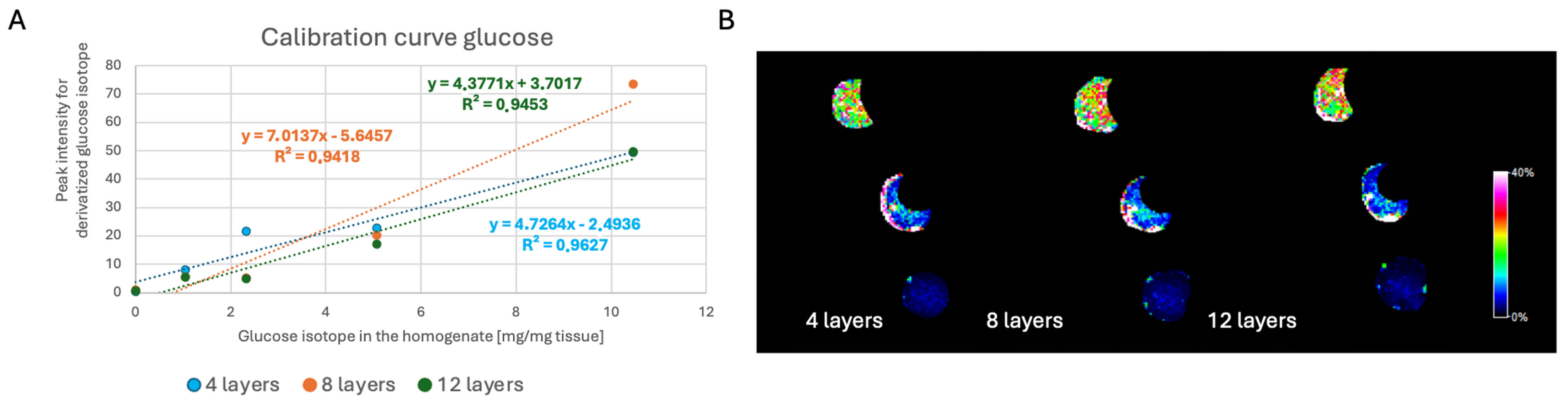 6 in the ‘point’. Two portions of homogenates were mixed with the aid of a PTFE pestle to ensure even distribution of the isotope after their ‘dilution’ with the clean homogenate. Then, the tube was centrifuged to pull the tissue to the bottom of the Eppendorf tube and to prevent drying the material and losing the precious sample with the isotope. This procedure was repeated three times to obtain 0.5, 0.25, and 0.125 of the maximum glucose and isotope concentration. In this way, with the clean tissue (‘blank’), we obtained 5 points for our calibration curve. To apply all the calibration curve points at once (‘with one cut’), we used the white of a boiled egg with prepared holes as a type of mould for the homogenate mixtures. The boiled egg white was cut with a scalpel to obtain a cuboid. For the calibration curve, holes were made in the boiled egg white using a glass capillary (approximately 2 mm in diameter). The homogenate mixture was placed into the holes using a Pos-D pipette. The entire system was frozen and kept at −20 °C until sectioning (see