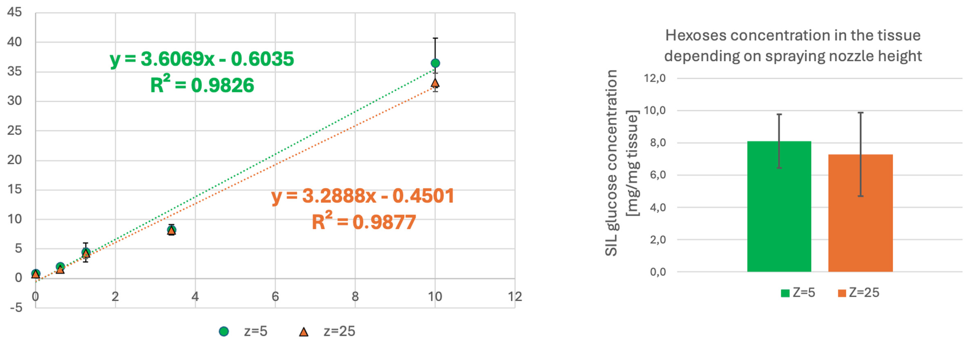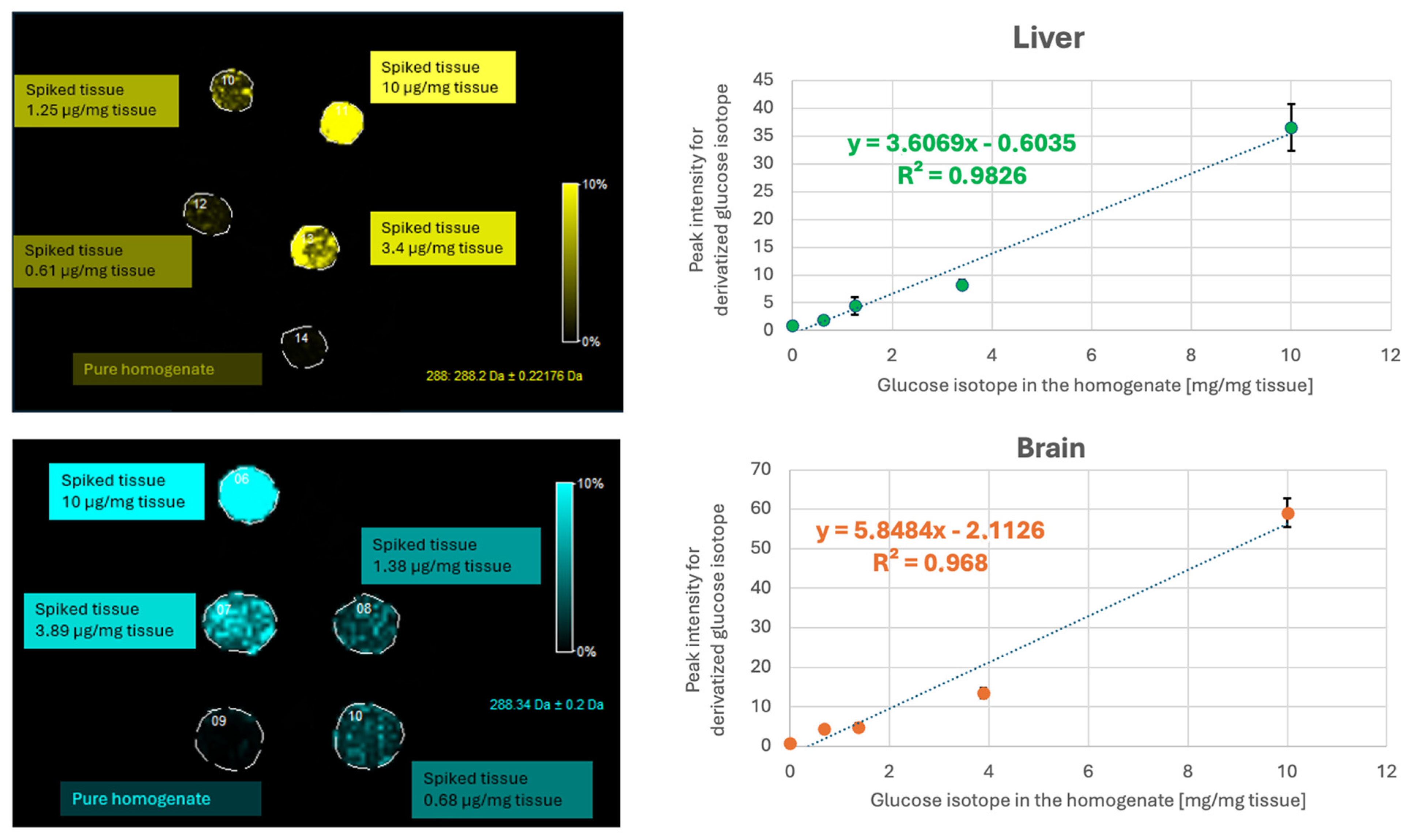 Ultimately, for the liver and the brain tissue, the most optimal analysis parameters were considered to be two layers of betaine aldehyde solution at a concentration of 4 mg/mL and the higher nozzle height (Z = 5) for derivatisation of SIL D-glucose