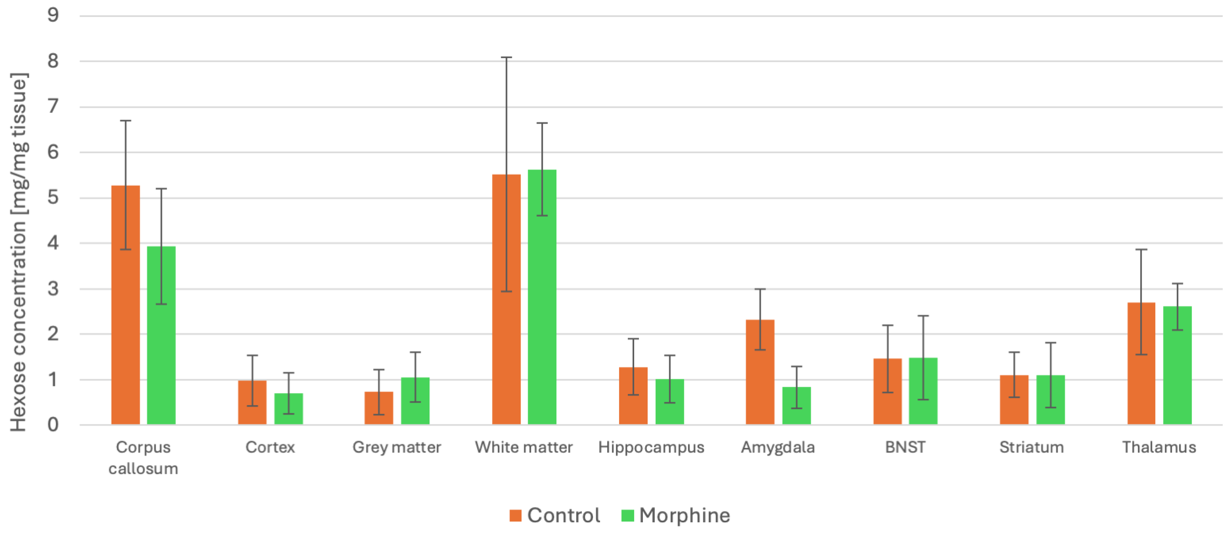 Lastly, we checked whether we could observe the effect of morphine addiction in different peripheral tissues and whether we could measure hexose concentration in various structures of the brain. Considering peripheral tissues, we were unable to indicate any substantial differences. In the sagittal section of the brain, the amygdala was identified as the structure affected by morphine administration; however, the findings are preliminary and additional research is necessary in this area.