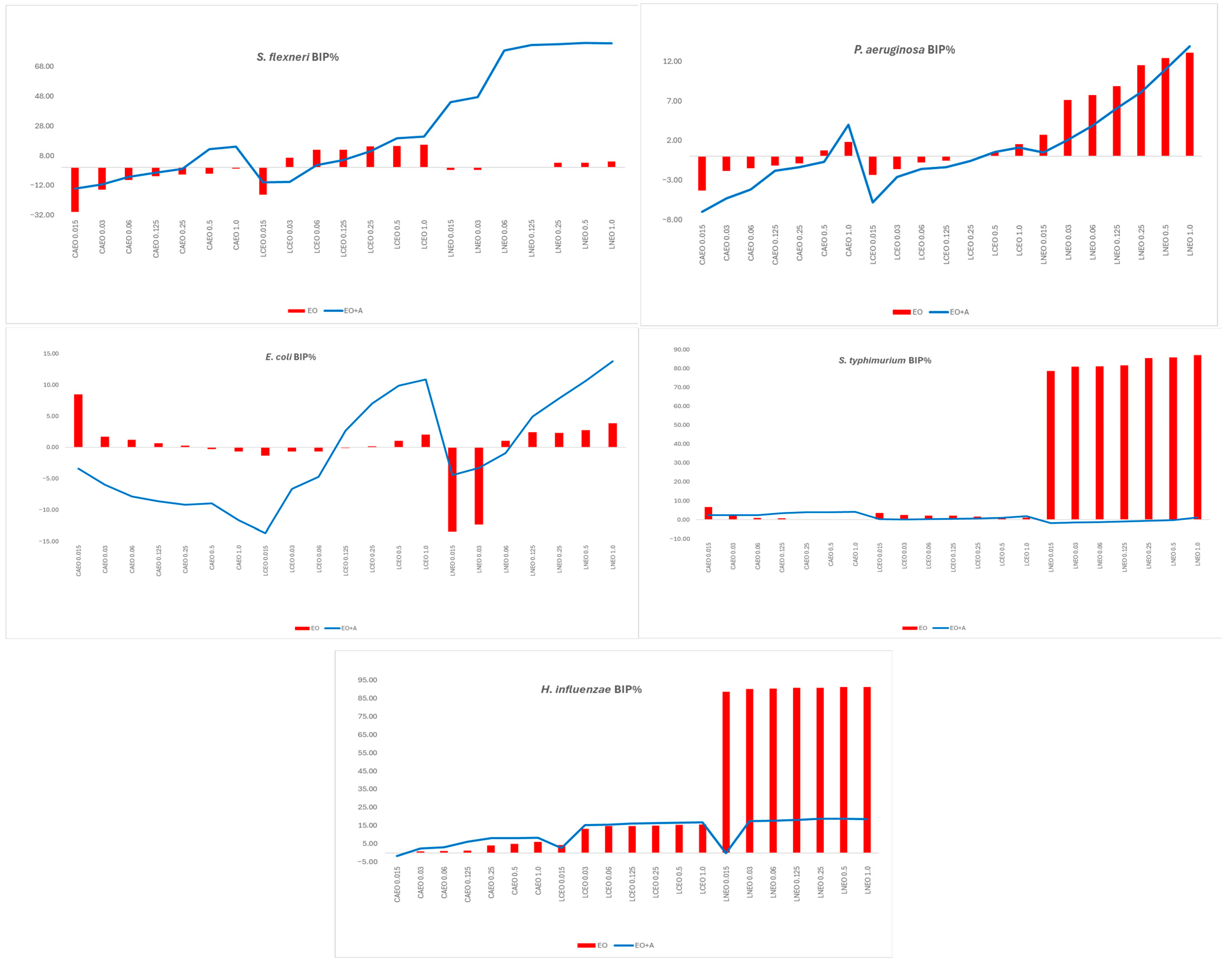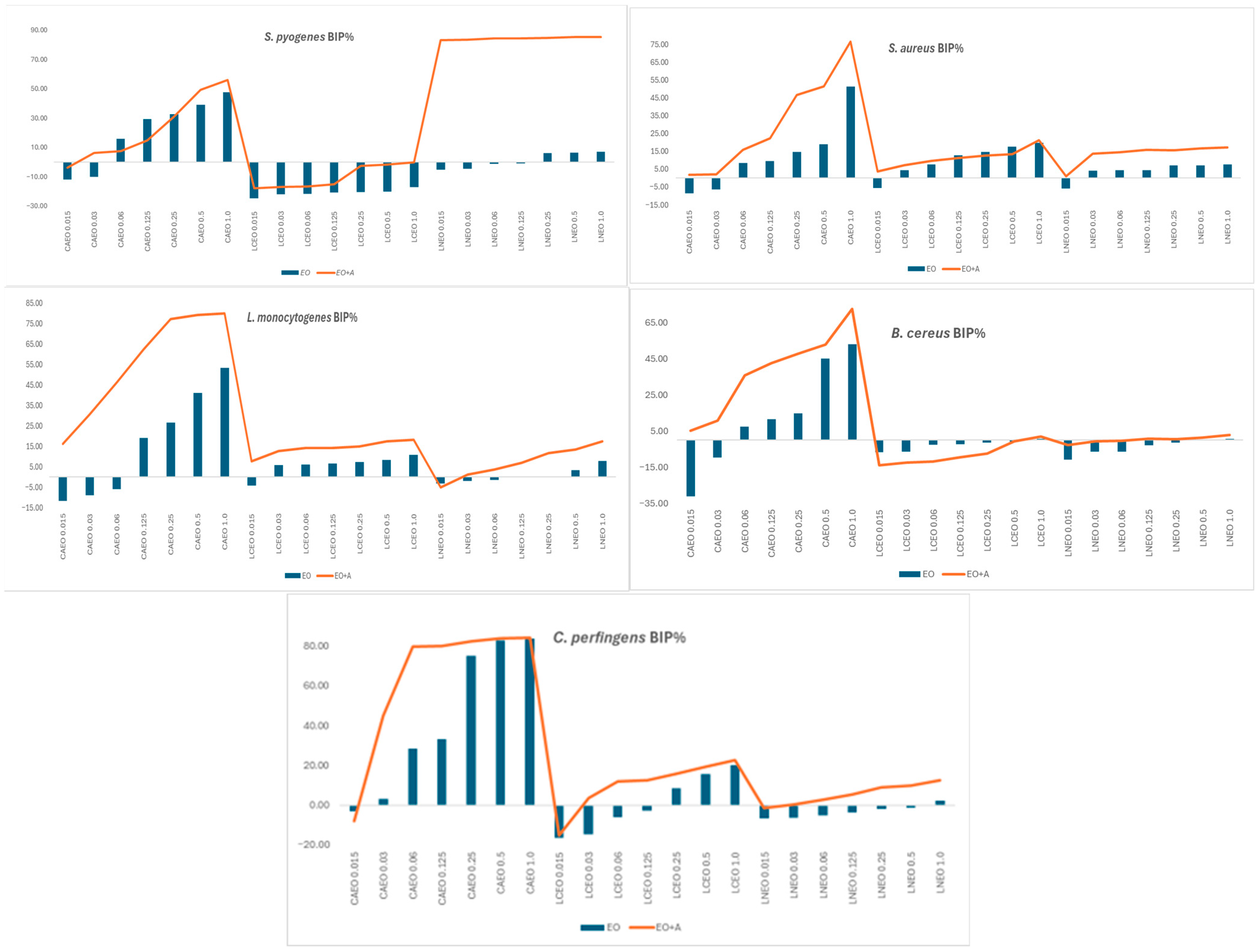 4.4. Evaluation of Ampicillin Potentiation by EOs Using MIC-Based Interaction Analysis and Sub-MIC Growth Inhibition