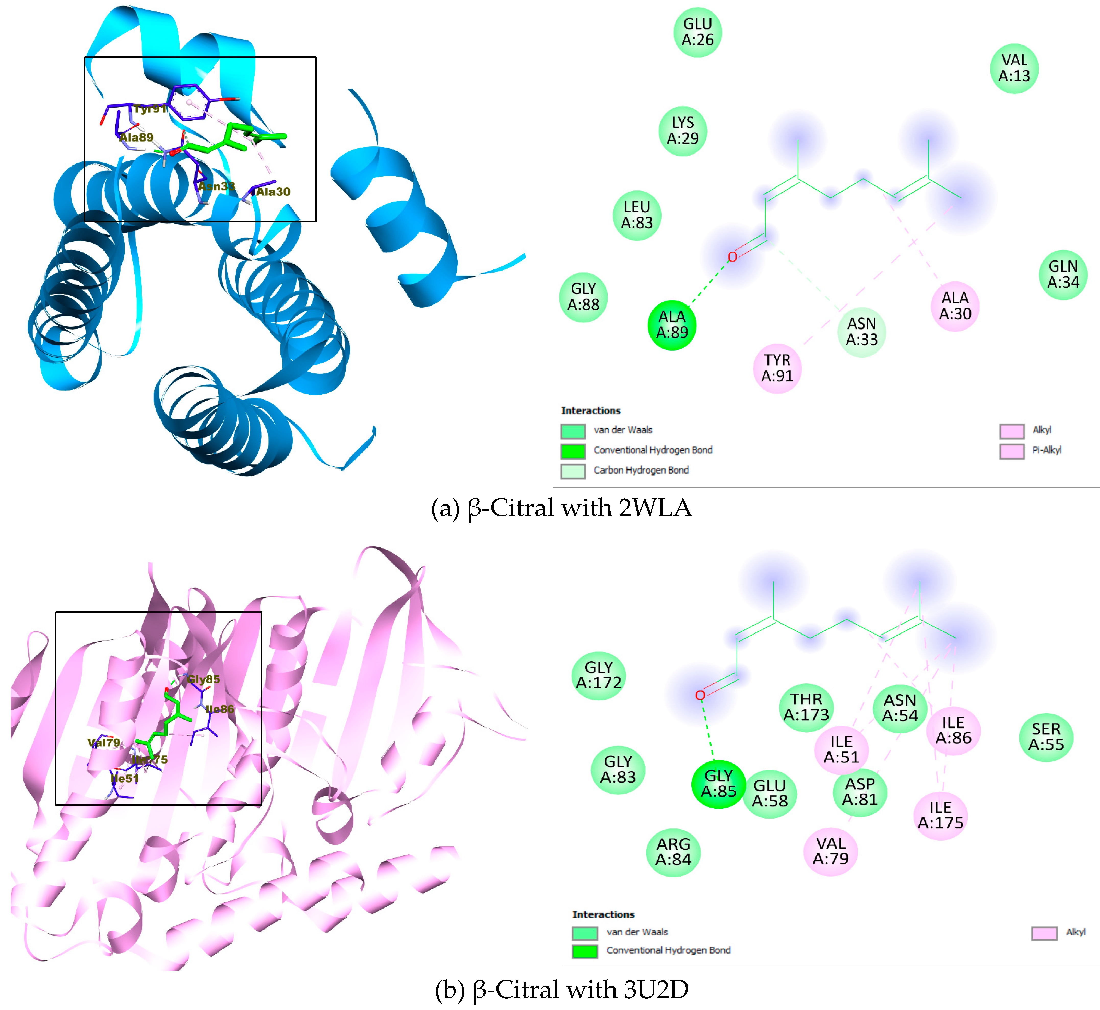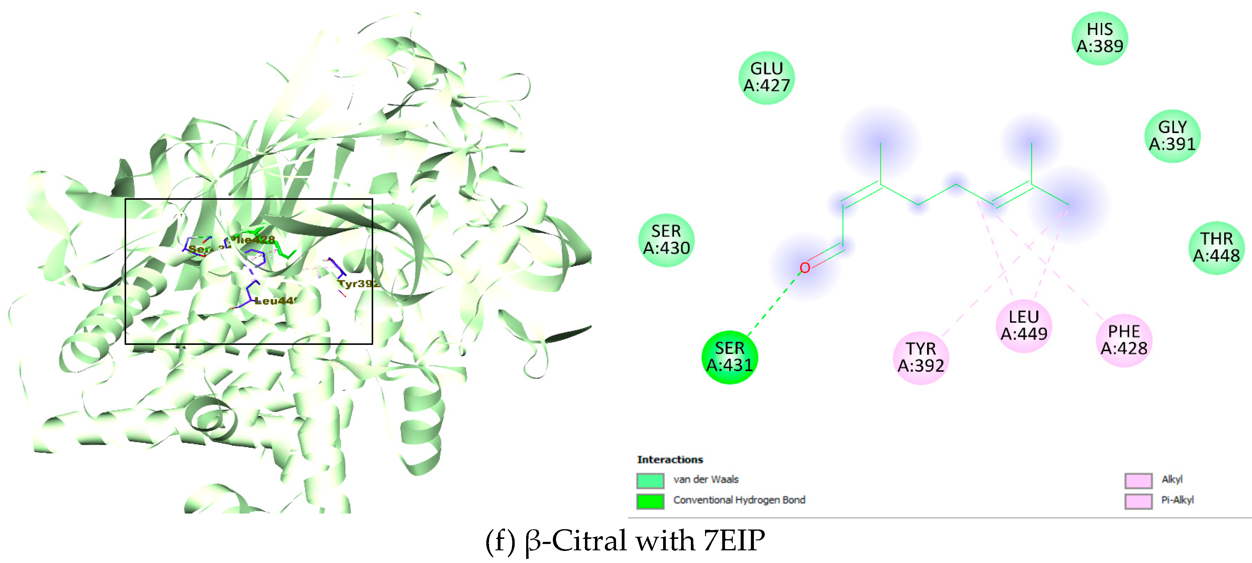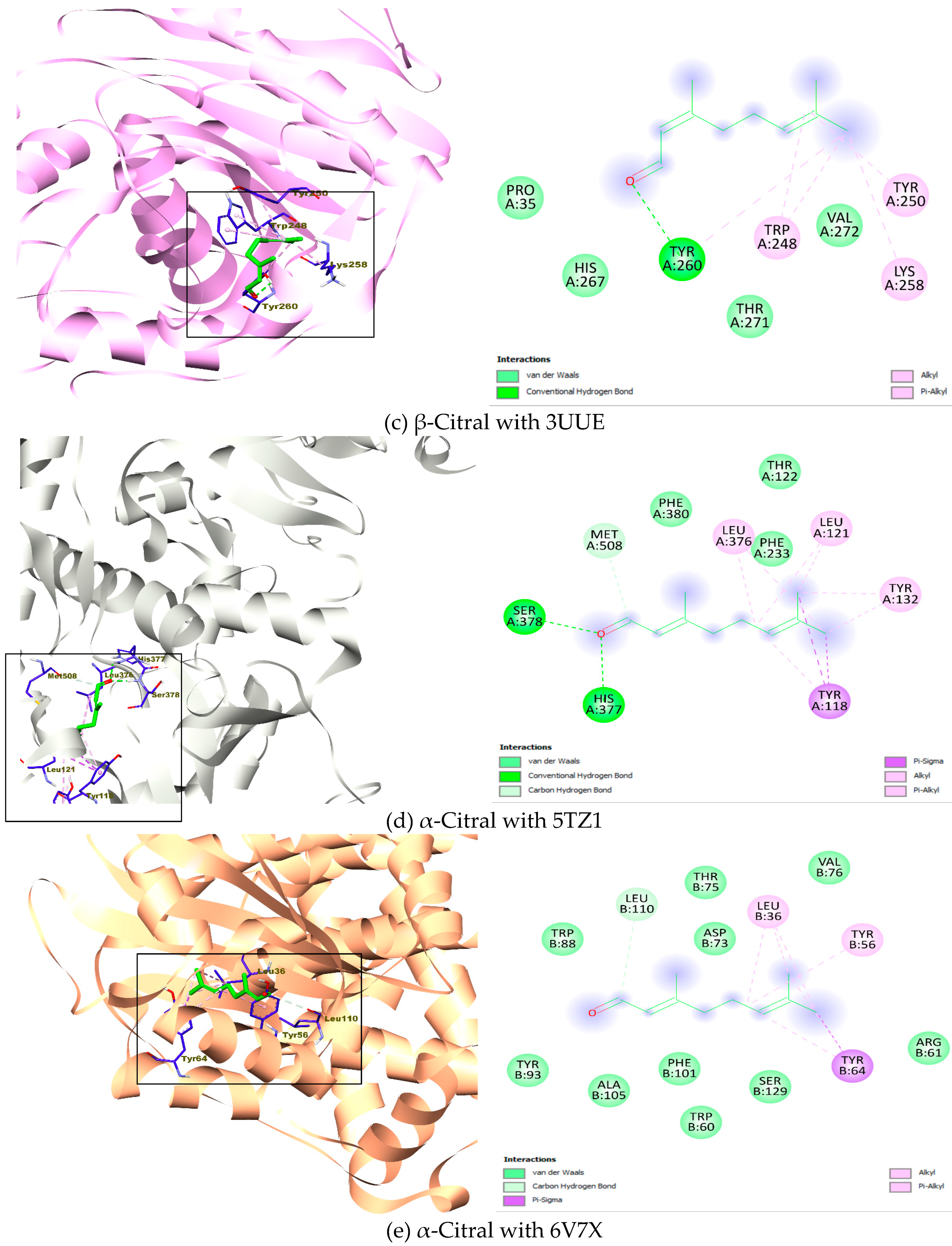 | 13 | α-Citral (CID: 638011) | −4.6 | −5.4 | −4.8 | −6.2 | −6.6 | −4.9 | Val A: 13, Ala A: 30, Ala A: 89 | Ile A: 51, Ile A: 86, Ile A: 175 | Val A: 266, Leu A: 270 | Tyr A: 118, Leu A: 121, Tyr A: 132, Leu A: 376, His A: 377. Ser A: 378, Met A: 508 | Leu B: 36, Tyr B: 56, Tyr B: 64, Leu B: 110 | Ala A: 278, Leu A: 286, Arg A: 306, Leu A: 342 |