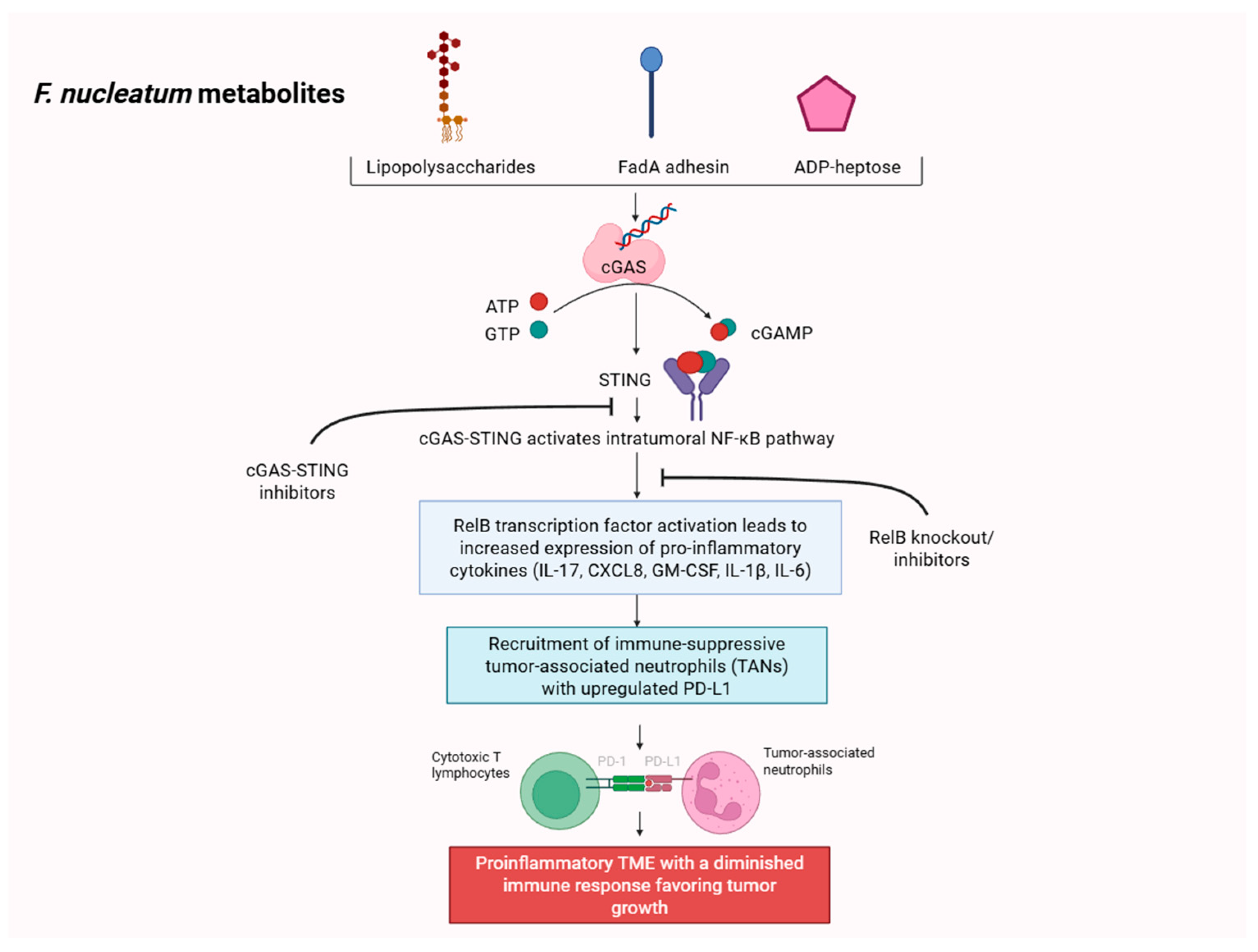 F. nucleatum-induced upregulation of PD-L1 expression from TANs was reversable with direct inhibition of the cGAS-STING pathway and RelB knockout [