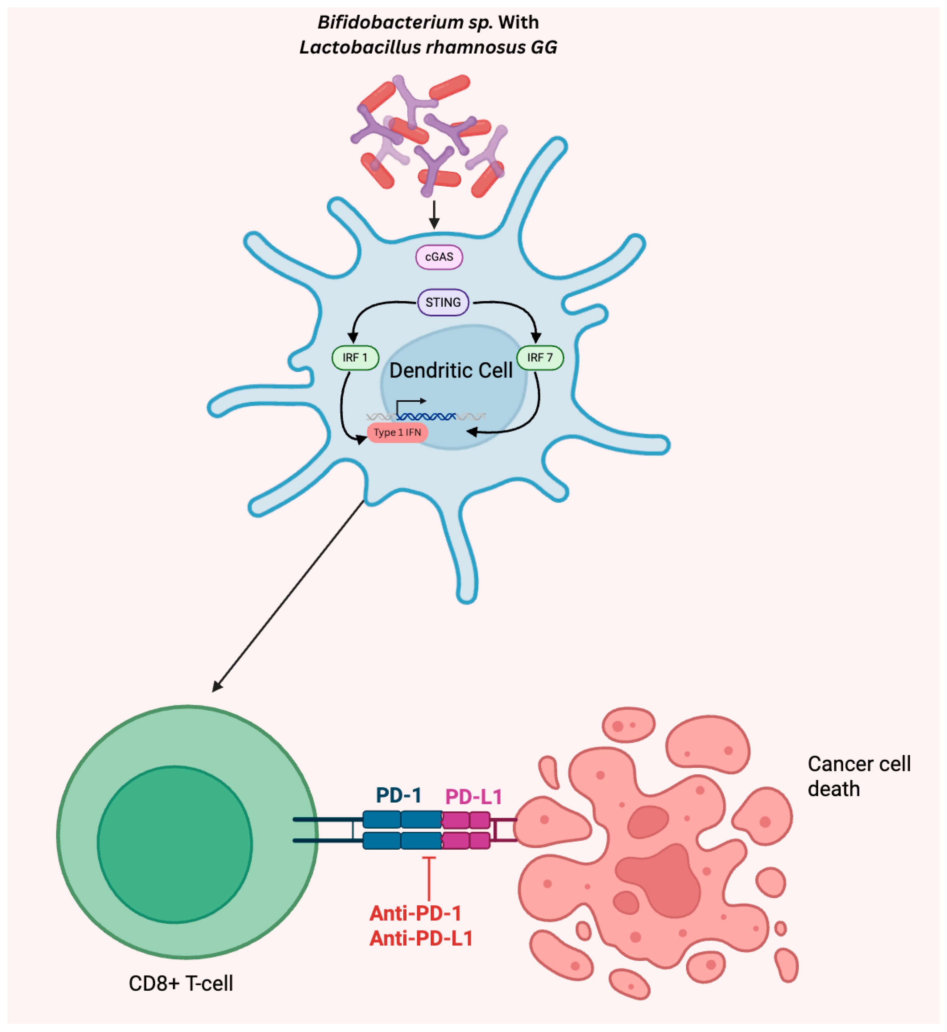 - Si, W.; Liang, H.; Bugno, J.; Xu, Q.; Ding, X.; Yang, K.; Fu, Y.; Weichselbaum, R.R.; Zhao, X.; Wang, L. Lactobacillus rhamnosus GG induces cGAS/STING- dependent type I interferon and improves response to immune checkpoint blockade. Gut 2022, 71, 521–533. [Google Scholar] [CrossRef] [PubMed]