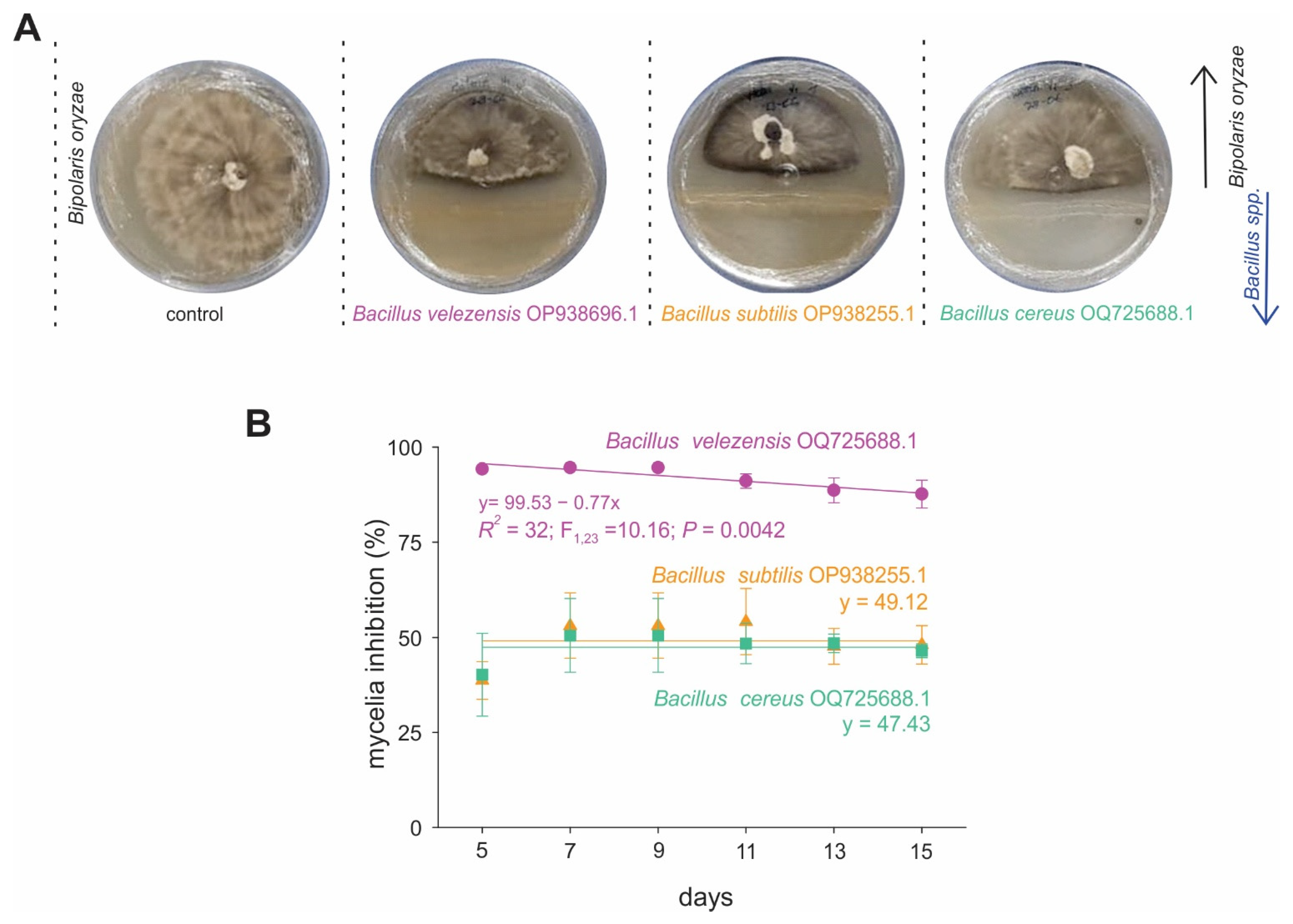 - Jiang, W.; Liu, J.; He, Y.; Payizila, A.; Li, Y. Biological Control Ability and Antifungal Activities of Bacillus velezensis Bv S3 against Fusarium oxysporum That Causes Rice Seedling Blight. Agronomy 2024, 14, 167. [Google Scholar] [CrossRef]