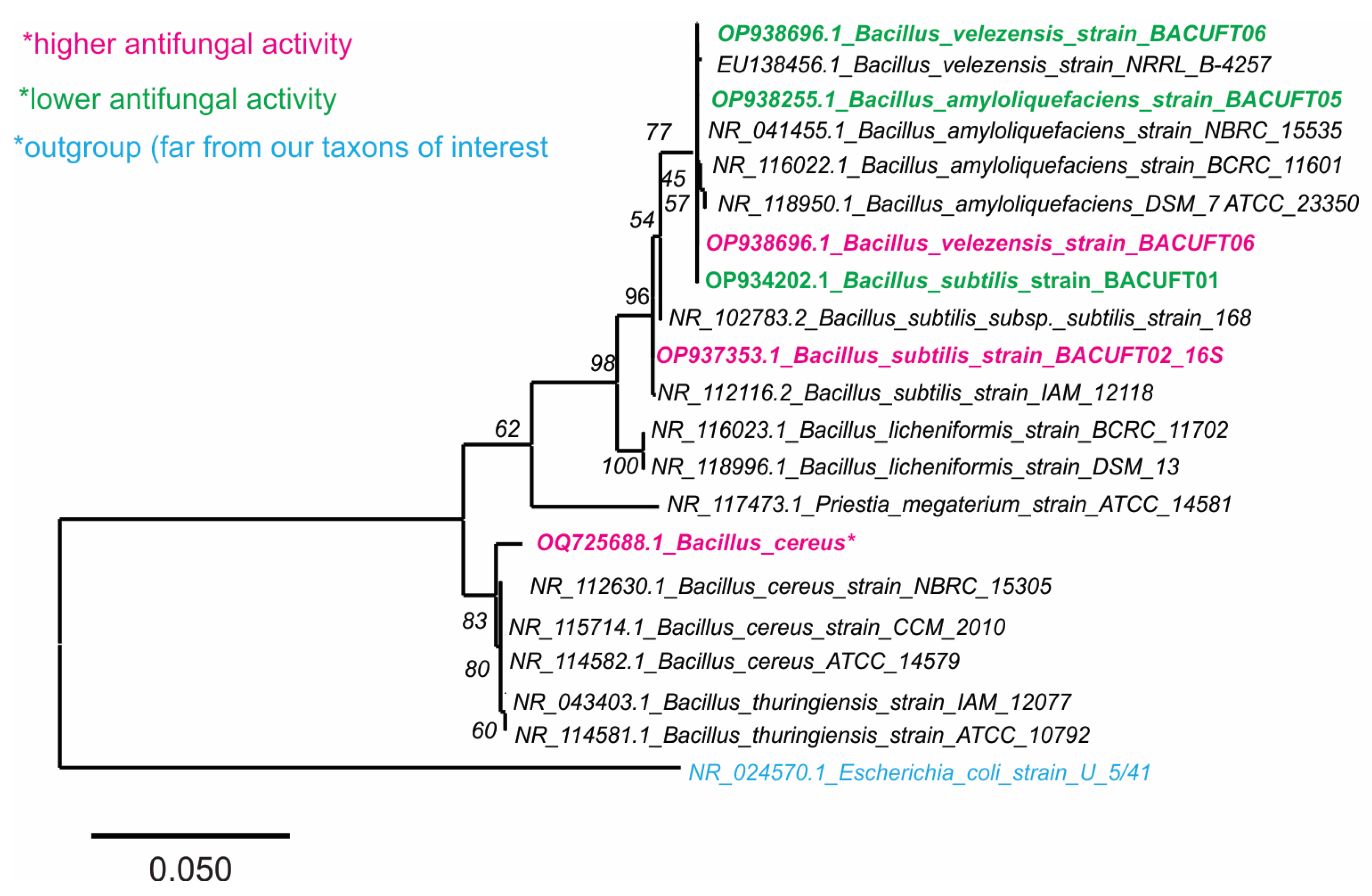 2.3. Phylogenetic Characterization of Bacillus Strains