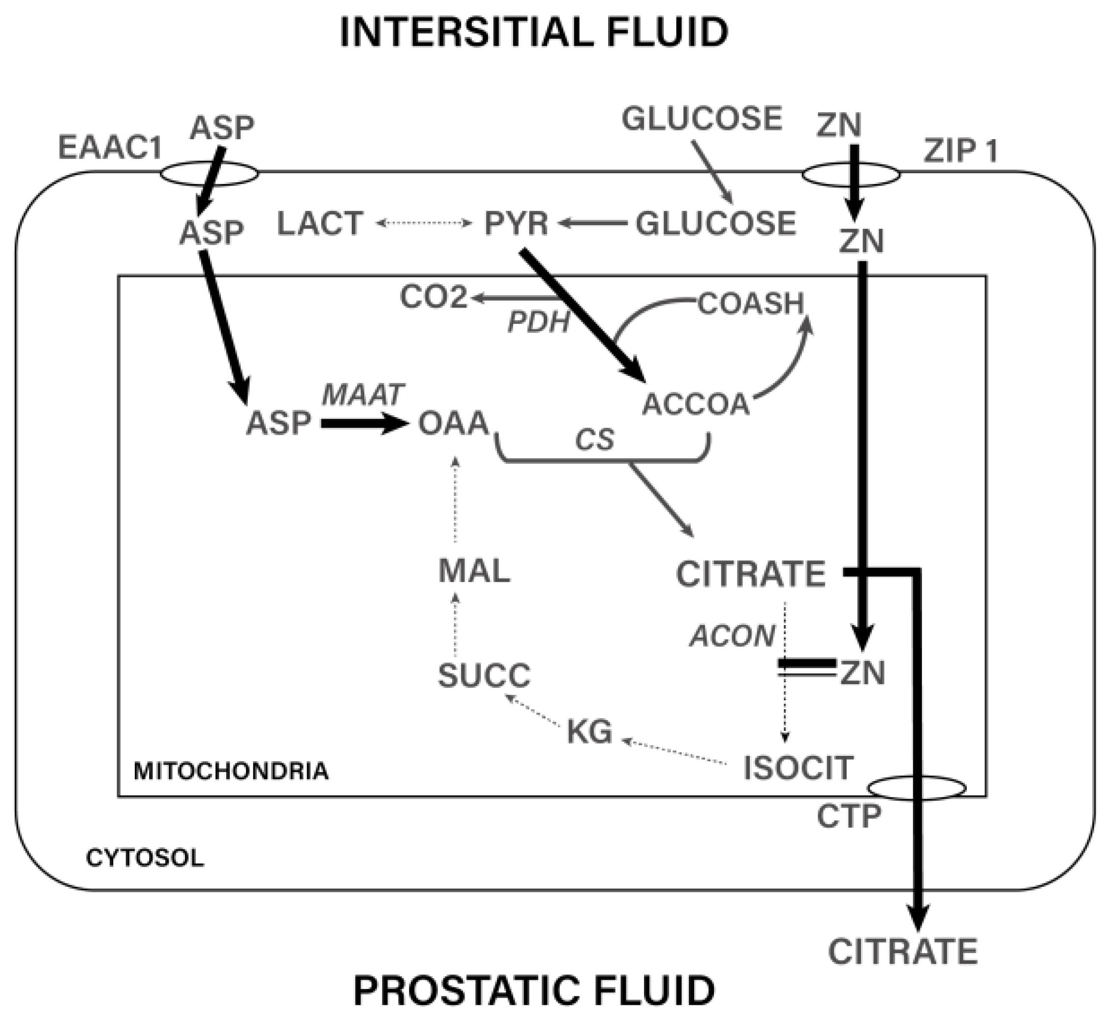 Figure 1) depicts the coordinated metabolic and transport processes that underlie the unique citrate-producing phenotype of prostatic secretory epithelial cells. Zinc is taken up from the interstitial fluid predominantly via the ZIP1 transporter and accumulates within mitochondria, where high Zn concentrations inhibit mitochondrial aconitase (m-aconitase). This Zn-dependent blockade truncates the Krebs cycle at the citrate → isocitrate step, preventing citrate oxidation and enforcing marked intracellular citrate accumulation. Citrate is subsequently exported to the prostatic fluid through the citrate transport protein (CTP). Aspartate (ASP), imported through the EAAC1 transporter, is converted to oxaloacetate (OAA) via mitochondrial aspartate aminotransferase (mAAT), while glucose metabolism supplies pyruvate and acetyl-CoA through glycolysis and pyruvate dehydrogenase (PDH). Citrate synthase (CS) condenses OAA and acetyl-CoA to generate citrate. Although downstream Krebs cycle intermediates (isocitrate, α-ketoglutarate, succinate, malate) are shown for contextual completeness, they do not participate meaningfully in citrate oxidation in the prostate due to Zn-mediated inhibition of aconitase. The resulting high intracellular citrate pool is characteristic of the normal and hyperplastic prostate and underpins its physiological secretion into seminal fluid (