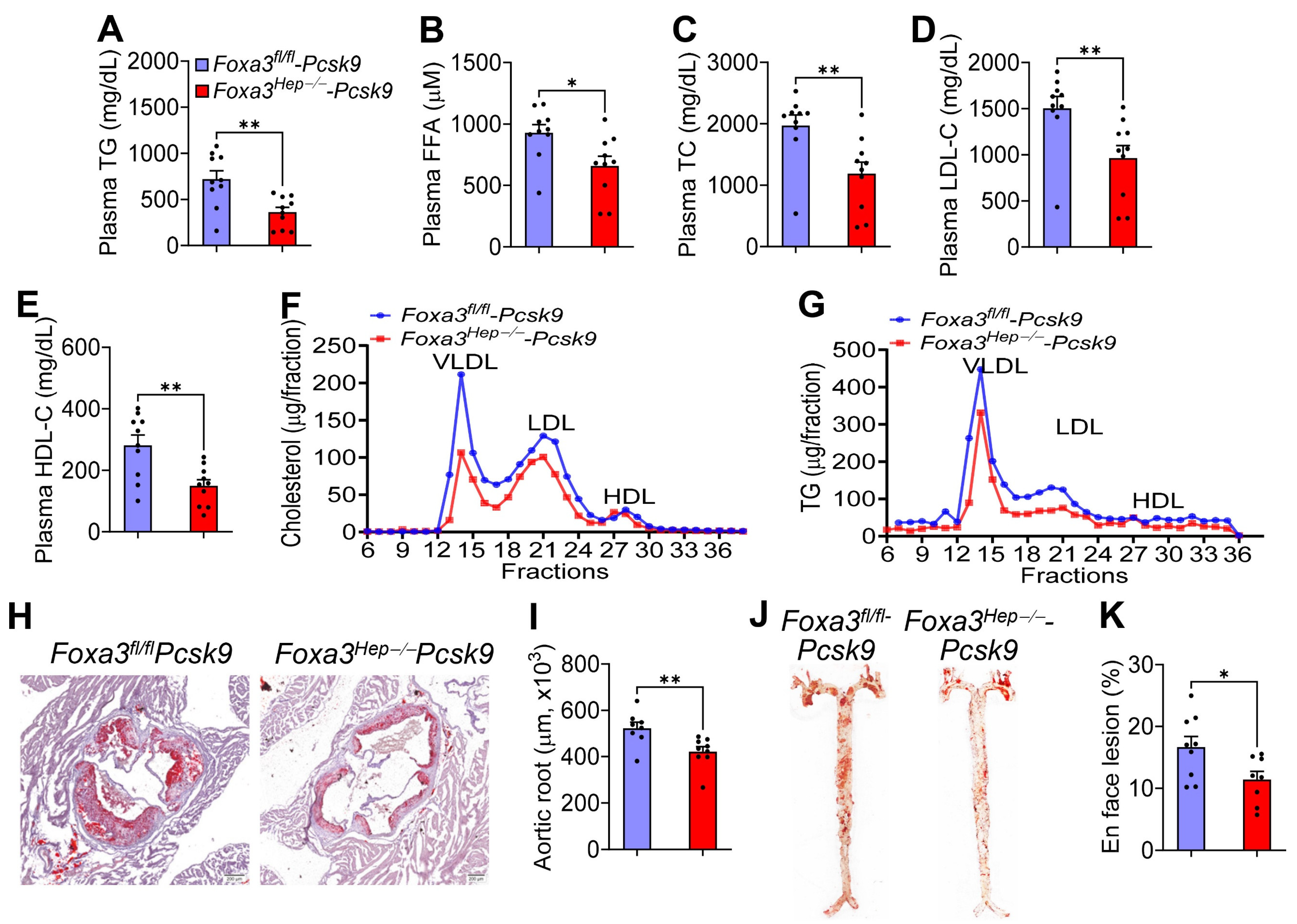 2.4. Loss of Hepatocyte Foxa3 Prevents the Development of Atherosclerosis in Hyperlipidemic Ldlr-Deficient Mice
