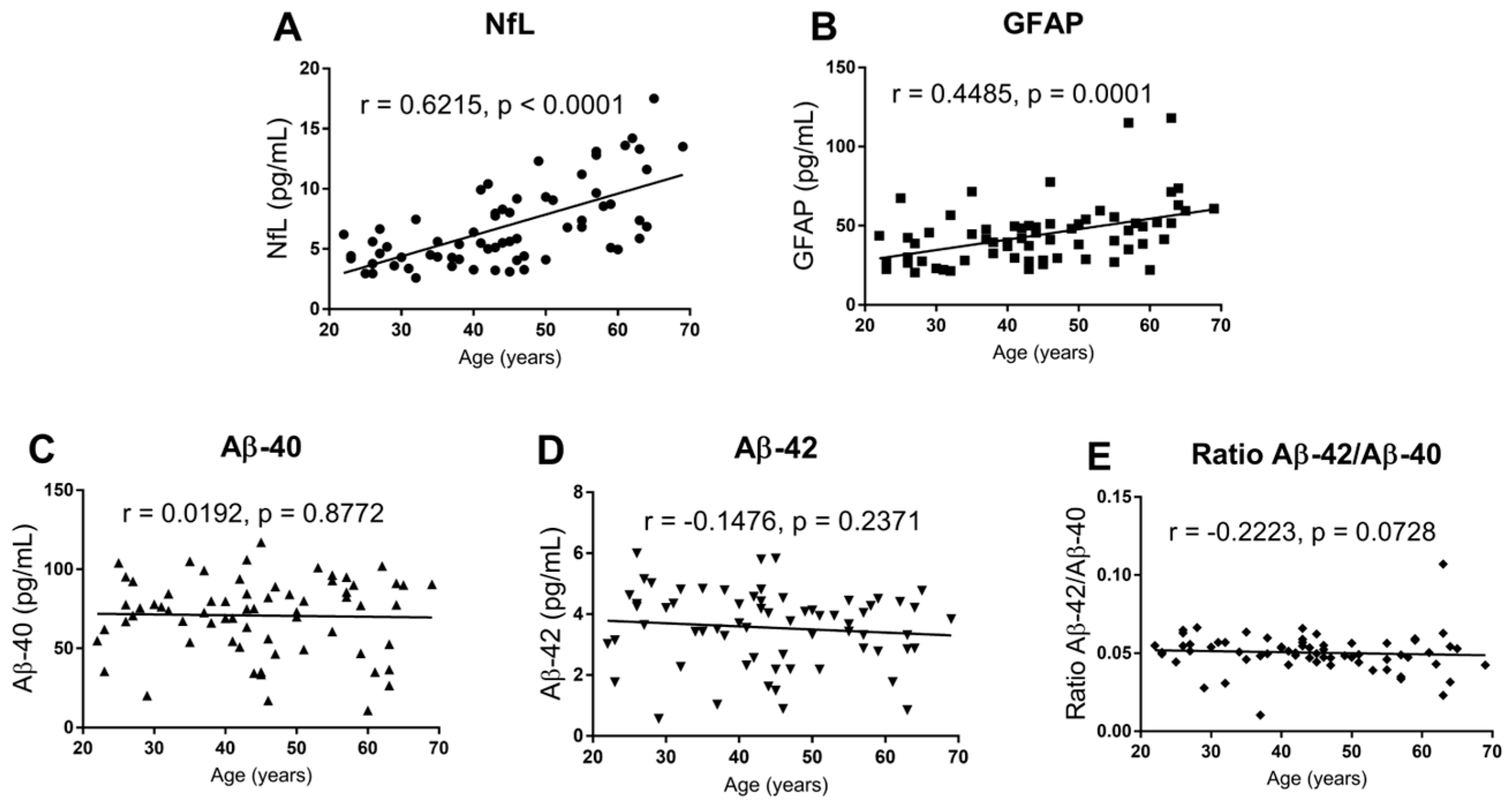 - Rodero-Romero, A.; Monreal, E.; Sainz-Amo, R.; García Domínguez, J.M.; Villarrubia, N.; Veiga-González, J.L.; Fernández-Velasco, J.I.; Goicochea-Briceño, H.; Rodríguez-Jorge, F.; de la Maza, S.S.; et al. Establishing Normal Serum Values of Neurofilament Light Chains and Glial Fibrillary Acidic Protein Considering the Effects of Age and Other Demographic Factors in Healthy Adults. Int. J. Mol. Sci. 2024, 25, 7808. [Google Scholar] [CrossRef]