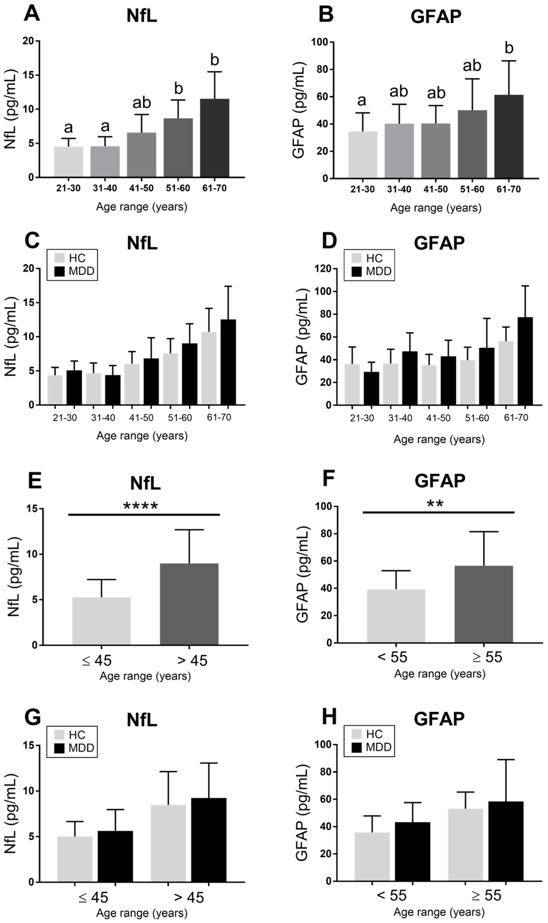 - Hviid, C.V.B.; Benros, M.E.; Krogh, J.; Nordentoft, M.; Christensen, S.H. Serum glial fibrillary acidic protein and neurofilament light chain in treatment-naïve patients with unipolar depression. J. Affect. Disord. 2023, 338, 341–348. [Google Scholar] [CrossRef]