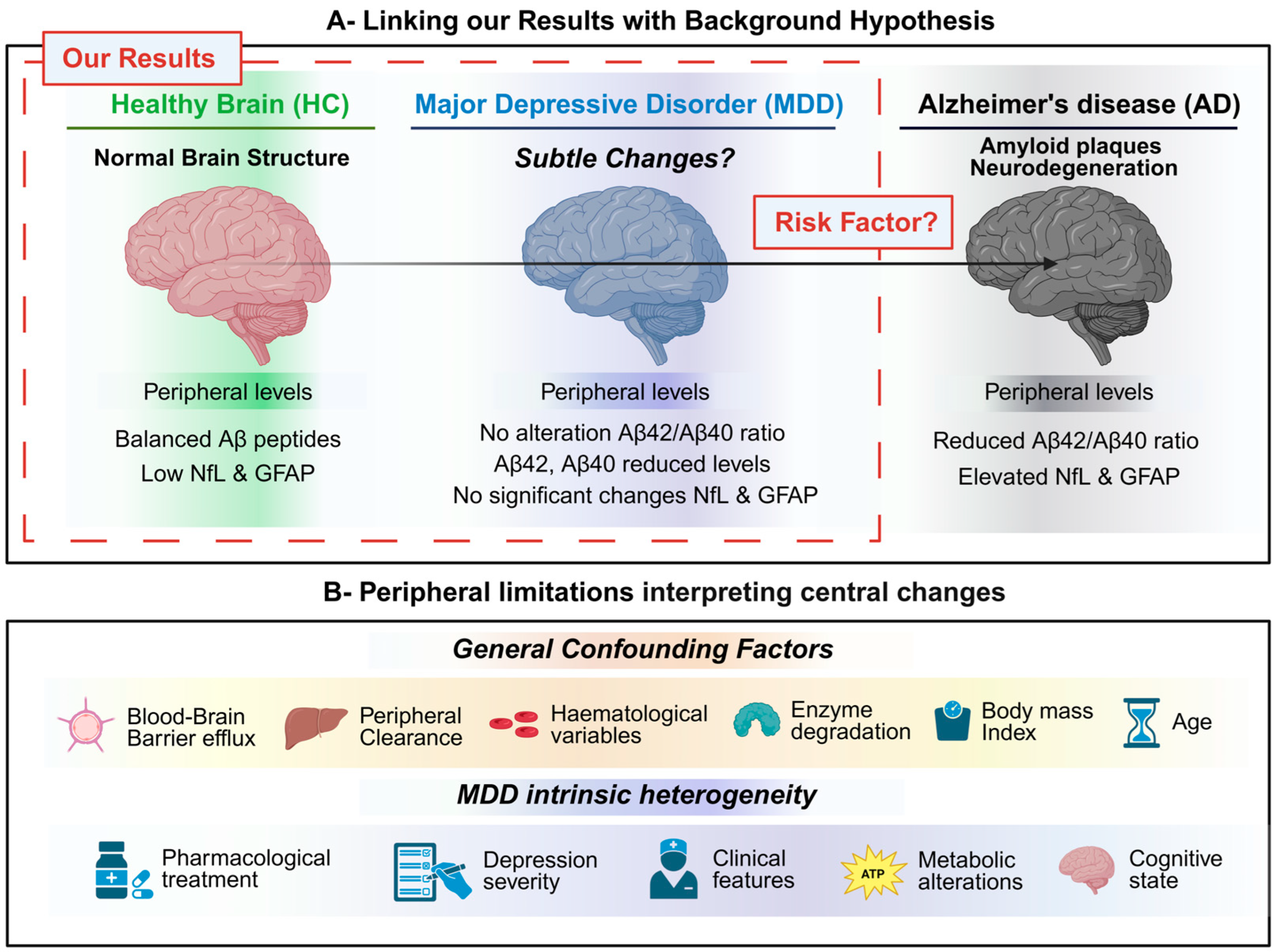- Pomara, N.; Bruno, D.; Plaska, C.R.; Ramos-Cejudo, J.; Osorio, R.S.; Pillai, A.; Imbimbo, B.P.; Zetterberg, H.; Blennow, K. Plasma Amyloid-β dynamics in late-life major depression: A longitudinal study. Transl. Psychiatry 2022, 12, 301. [Google Scholar] [CrossRef]