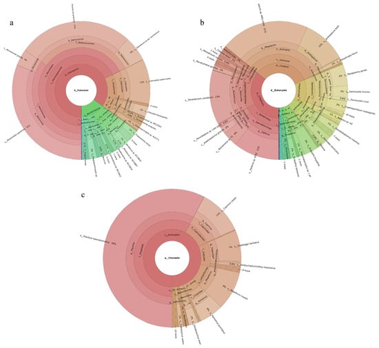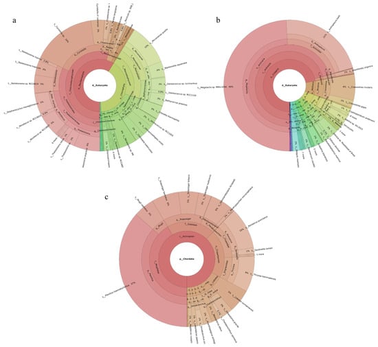 Species composition and relative abundance at different taxonomic levels in the Western Furong Island Marine Ranching Area. (a): phytoplankton; (b): invertebrates; (c): fish. Different colors represent different taxonomic groups. Taxa with very low relative abundance are not individually shown in the figure. Detailed taxonomic information is provided in Supplementary Materials Table S3.